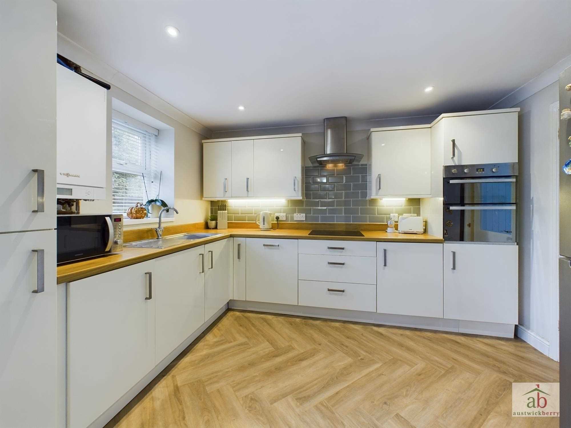 Double glazed window to the rear, wall mounted boiler, stainless steel sink with mixer tap, electric hob with chimney extractor hood over, double electric oven, work surface with fitted matching wall and base units above and below, integrated dishwasher. LVT flooring.