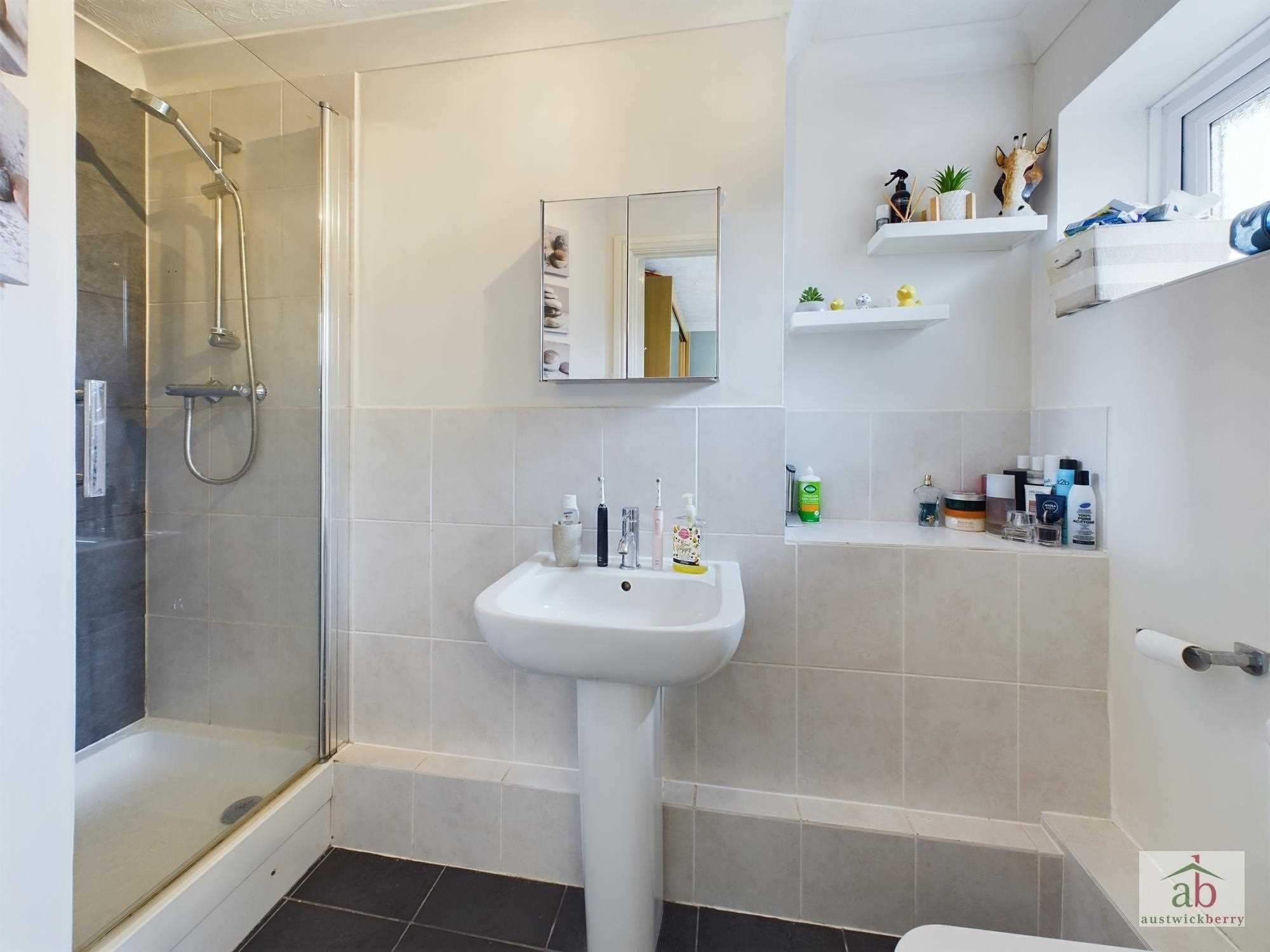 Walk in shower enclosure with glass door, pedestal hand wash basin, low level wc, tiled splashbacks, heated towel radiator, double glazed window to front.