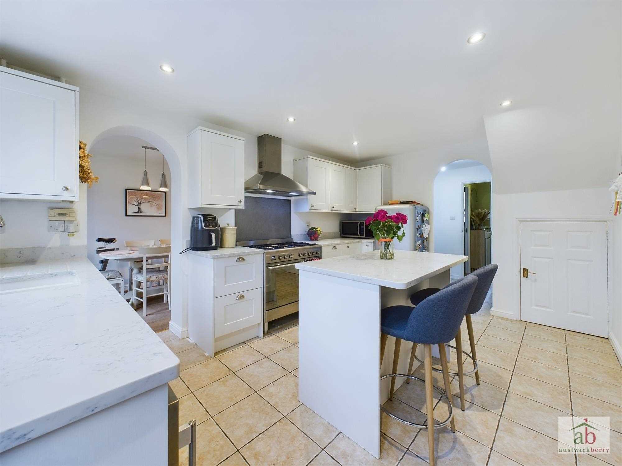 Double-glazed window and double-glazed door overlooking the rear garden. Centre island, sink and drainer with mixer taps set in work surfaces. Space for free standing smeg double oven/hob , integrated dishwasher, half tiled surround.