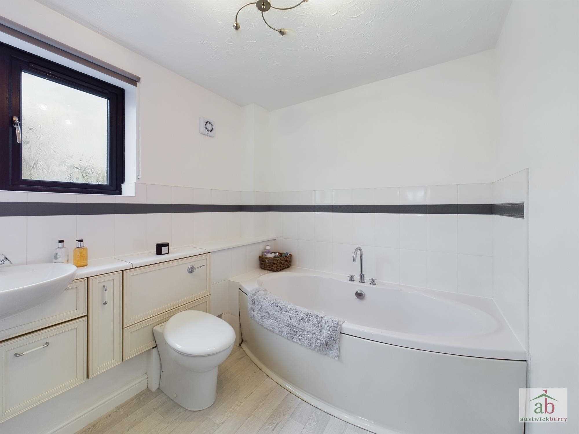 Double-glazed window to the rear, vanity wash basin, panel enclosed bath, low level W.C., single radiator, half tiled surround.
