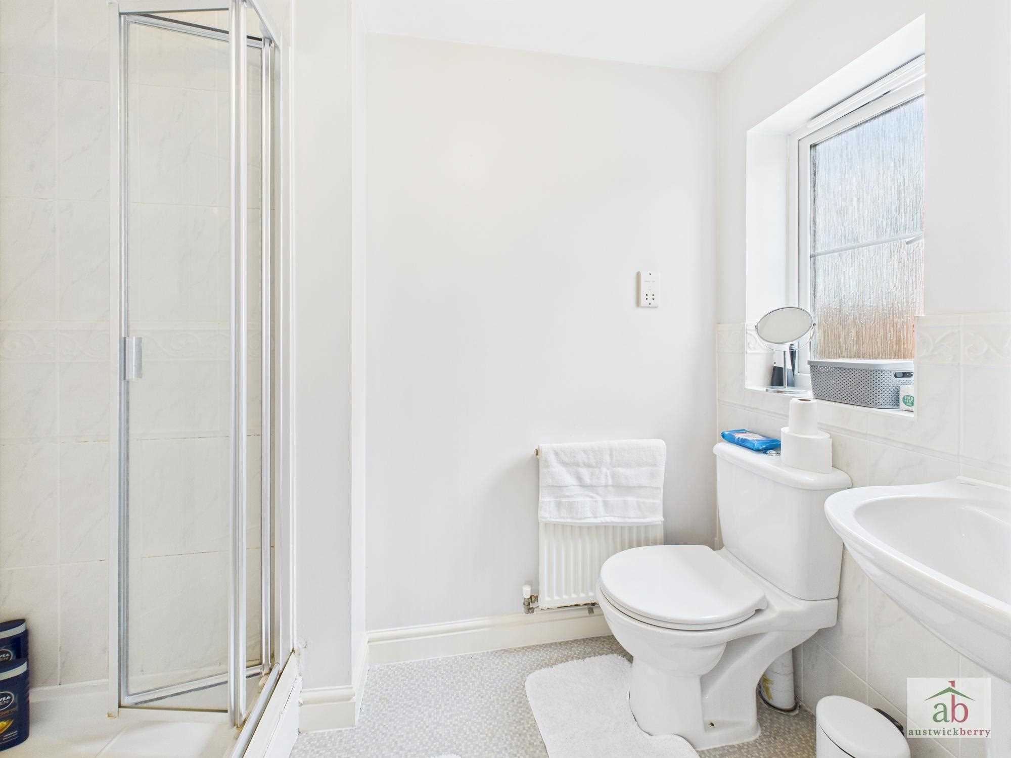 Double width shower enclosure with sliding screen and stainless steel shower attachment, pedestal hand wash basin, low level wc, single radiator, tiled splashbacks, double glazed window to side.