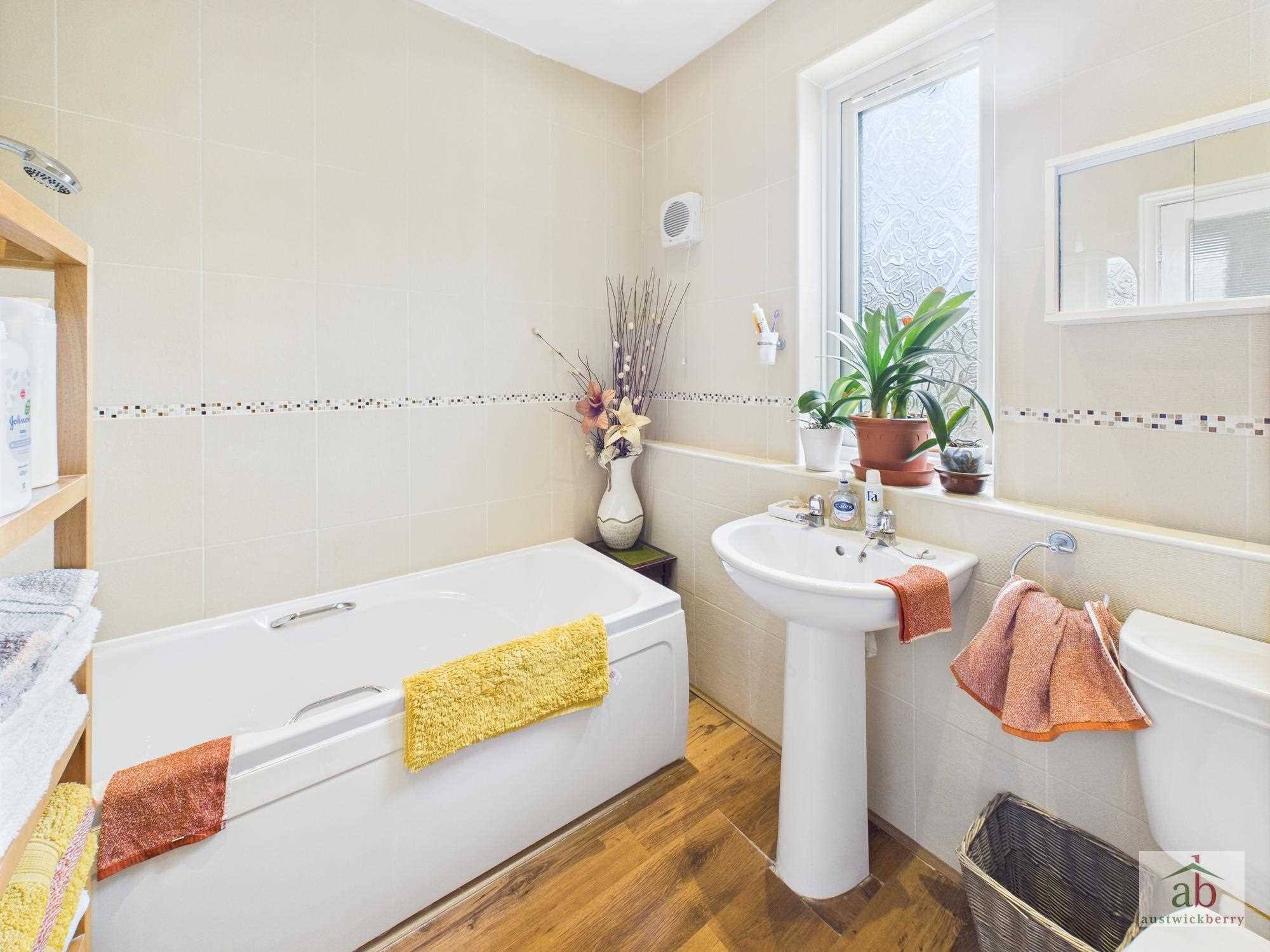 Panel enclosed bath, glass shower screen, radiator, low level wc, pedestal hand wash basin, double glazed window to rear, fully tiled.