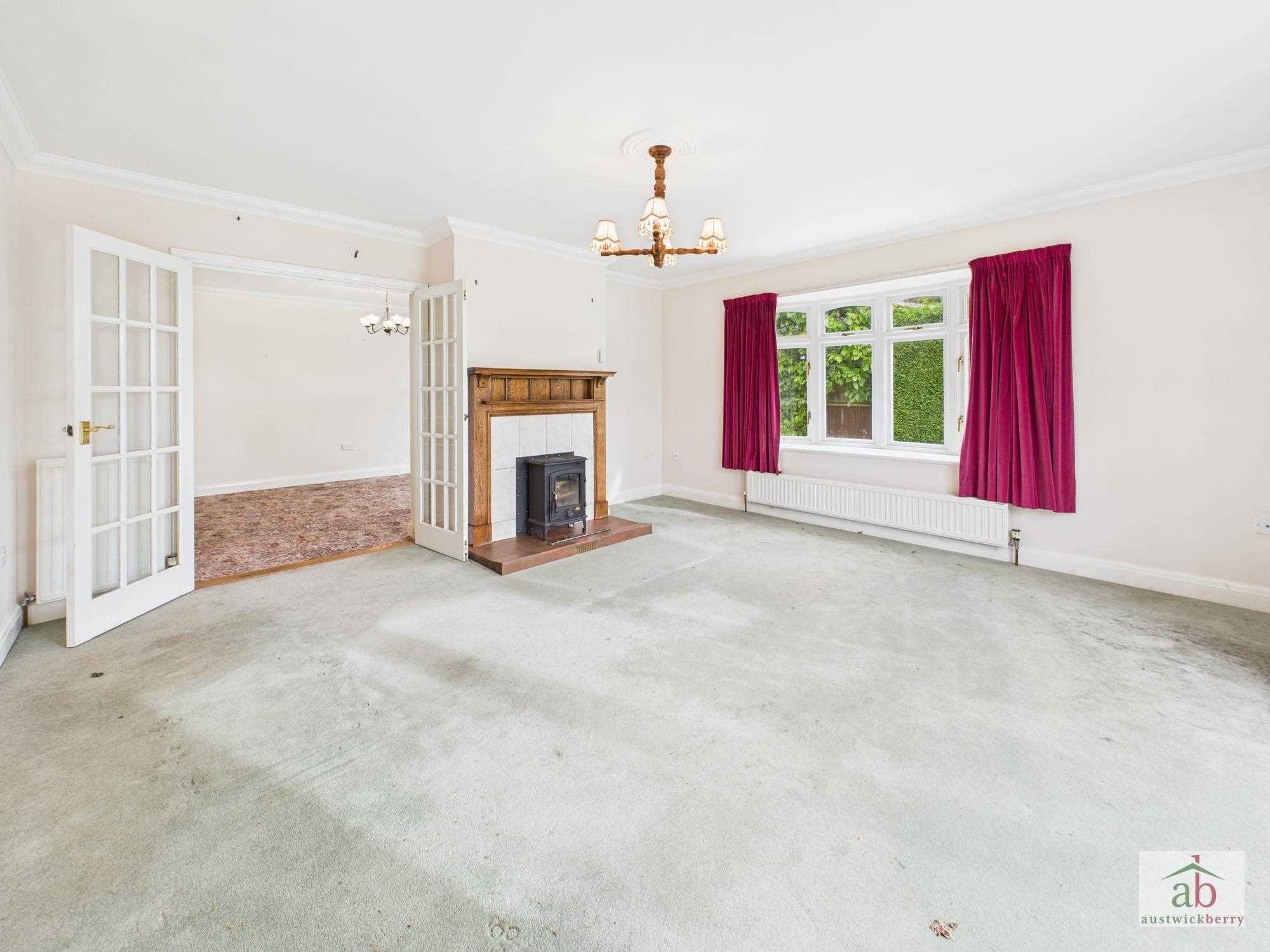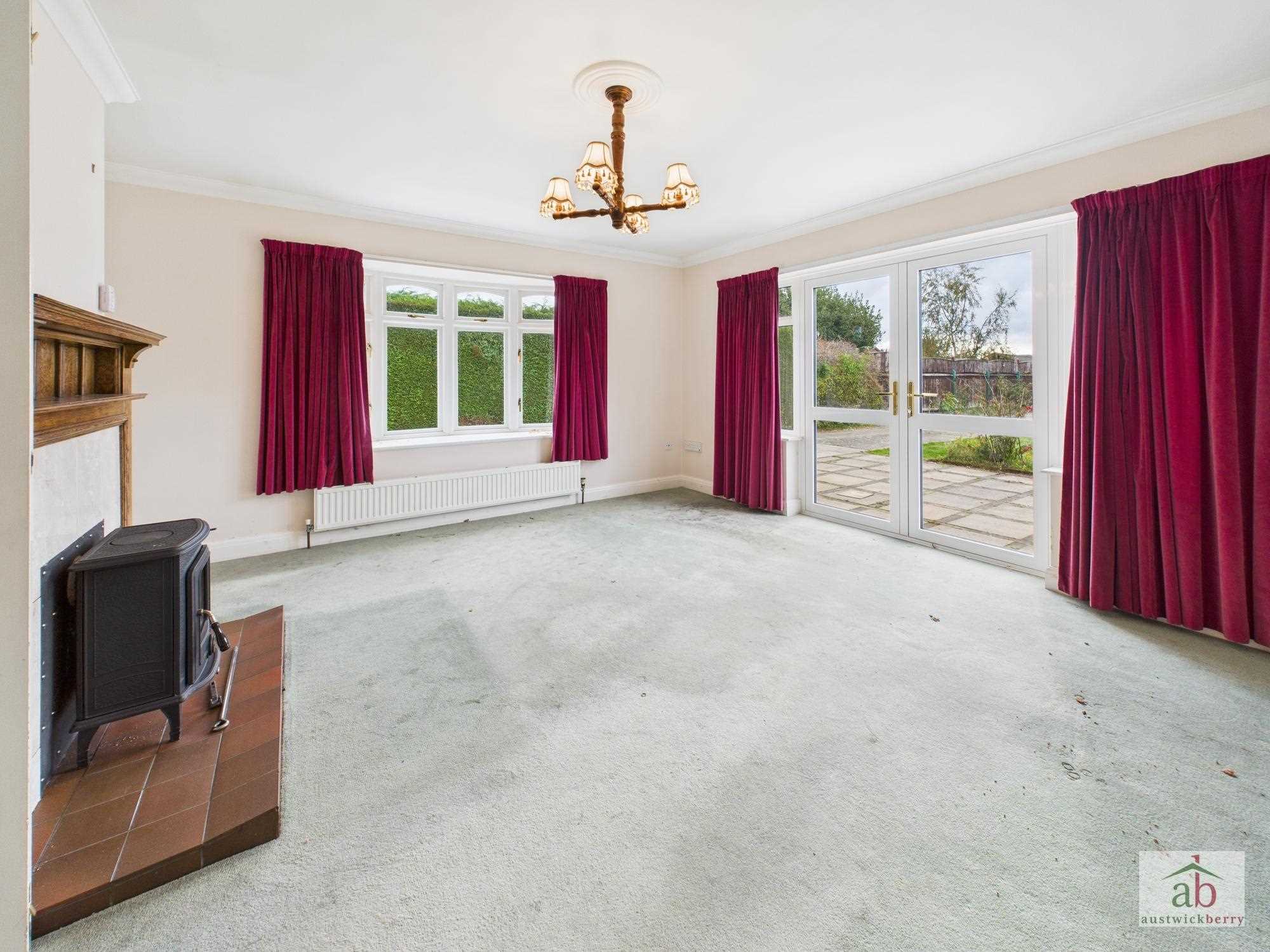 Double glazed box bay window to side, double radiator x2, double doors onto rear garden, feature fireplace with wood burner and wooden mantel.