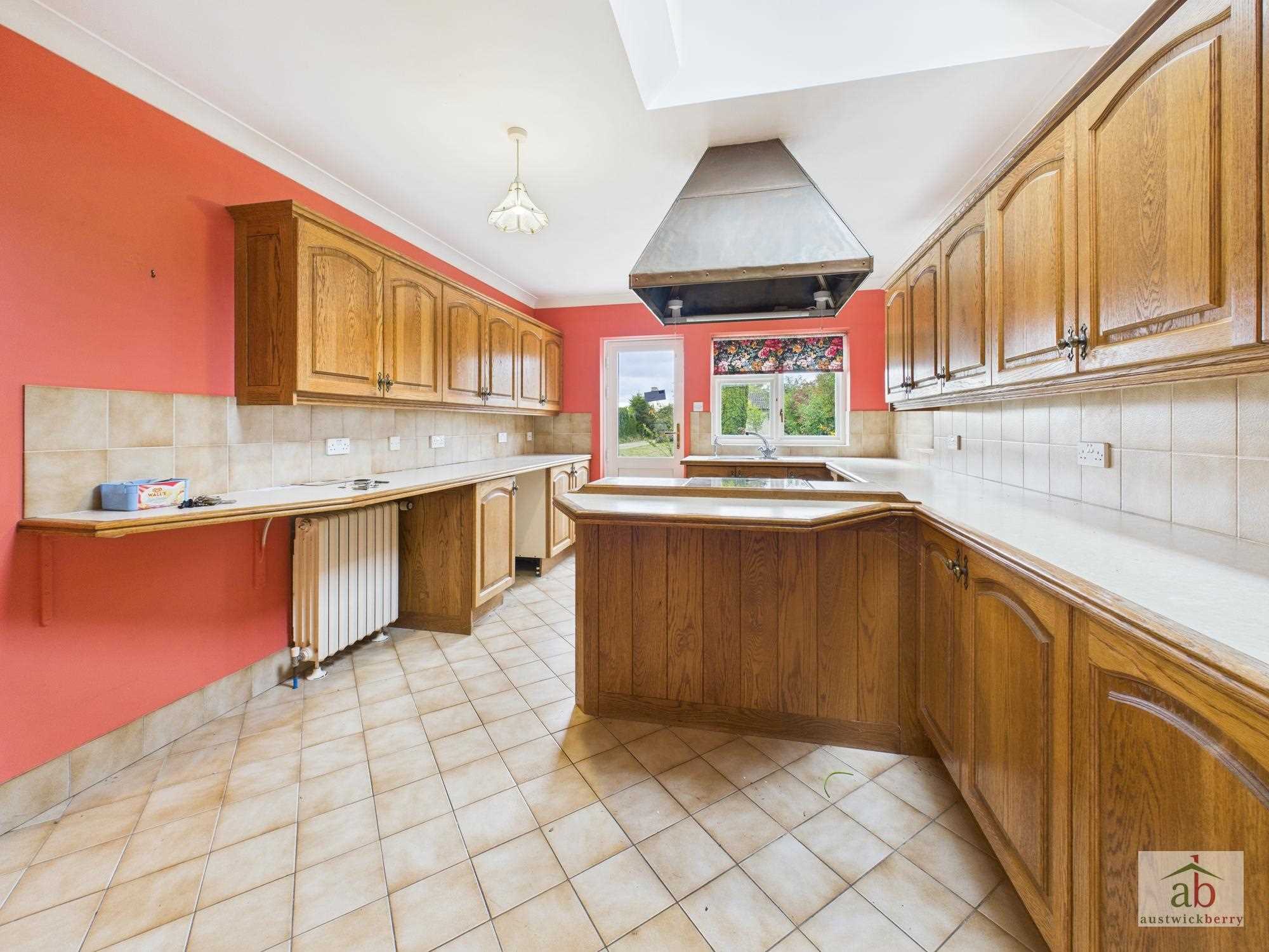Double glazed window and door to rear onto garden, one and a half sink and drainer with mixer tap, work surfaces with fitted matching wall and base units above and below, cooker point with chimney extractor hood over, tiled floor, splashbacks.