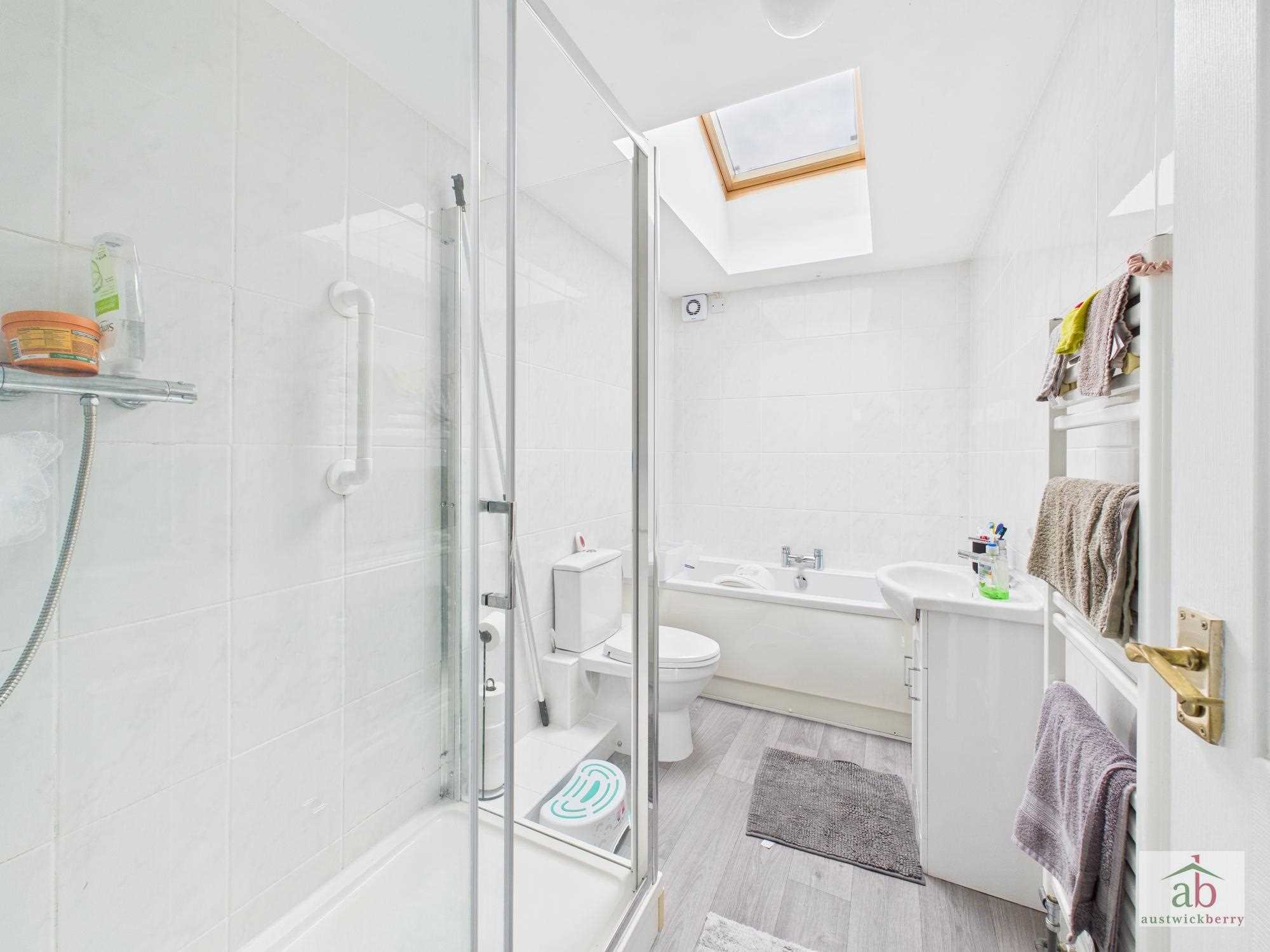 Contemporary skylight, fully tiled surround, panel enclosed bath with center stack mixer taps, vanity hand wash basin with cupboards under, low level wc, walk in shower cubicle, luxury flooring, contemporary towel rail.