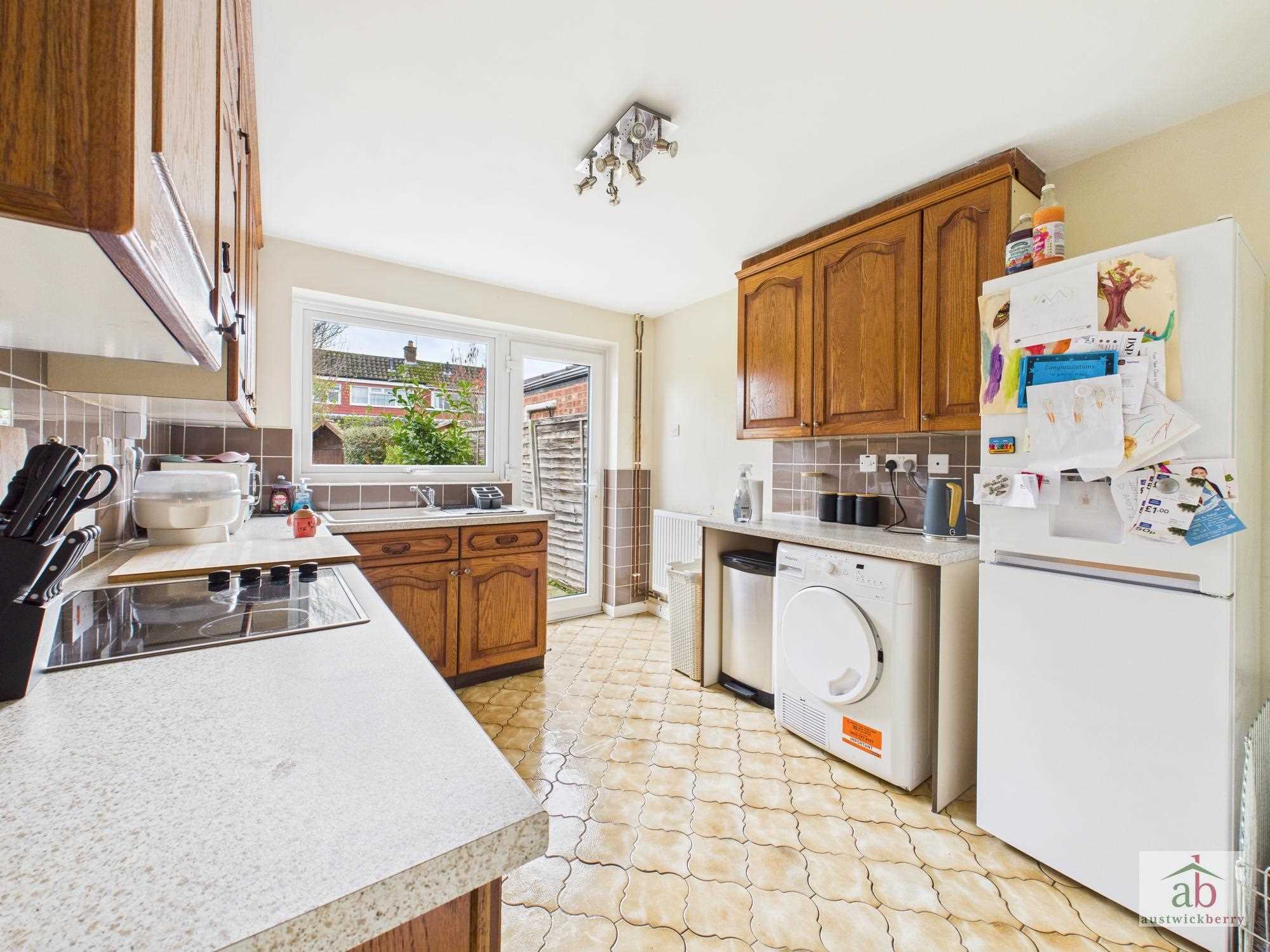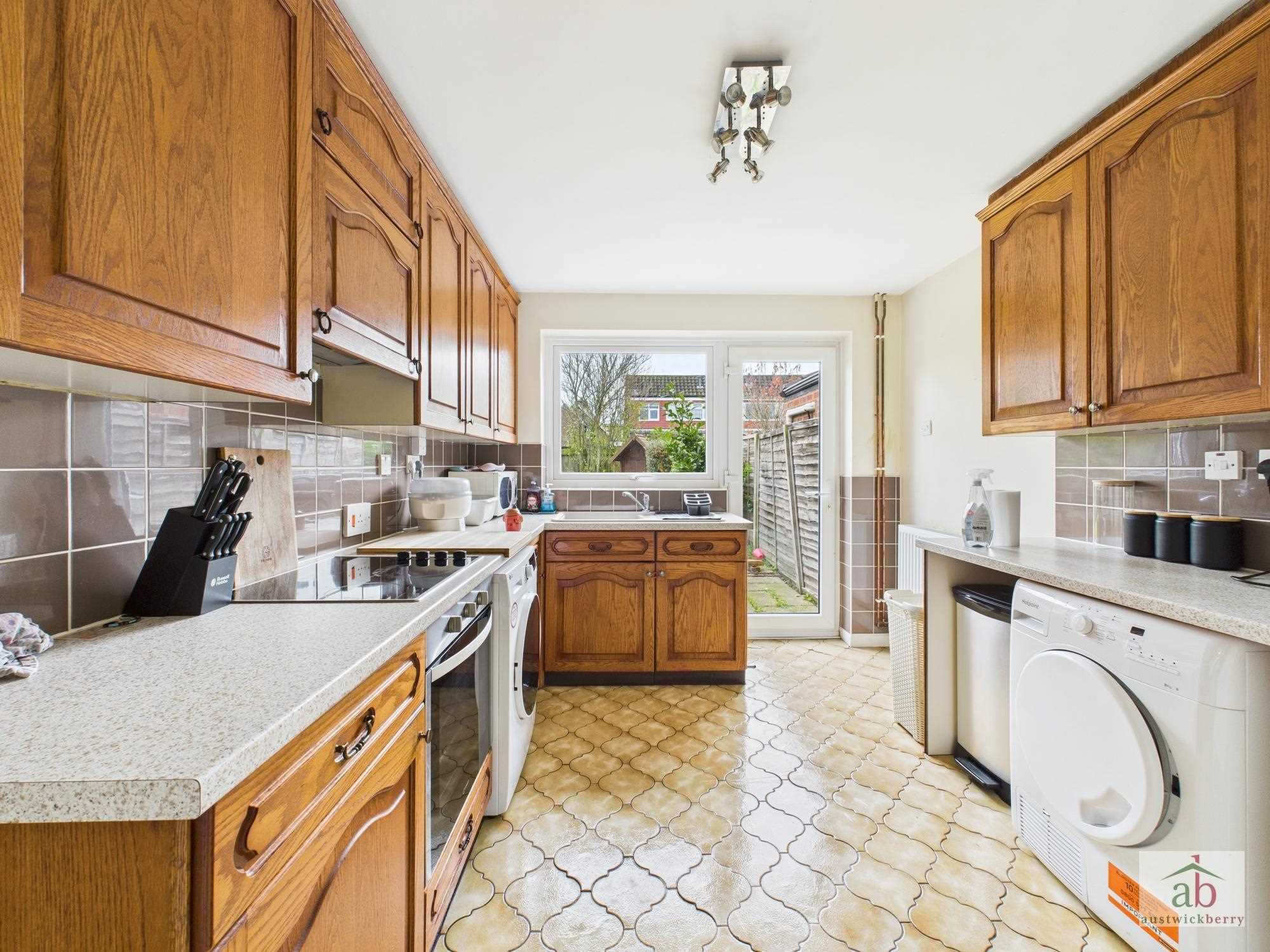 Double glazed window and door overlooking rear garden, sink and drainer with mixer taps set in work surfaces, further range of work surfaces, wall mounted cupboards, integrated hob, oven, extractor, half tile surround, further wall mounted cupboards, space for washing machine, further work surfaces counter, space for tumble dryer, space for fridge freezer.