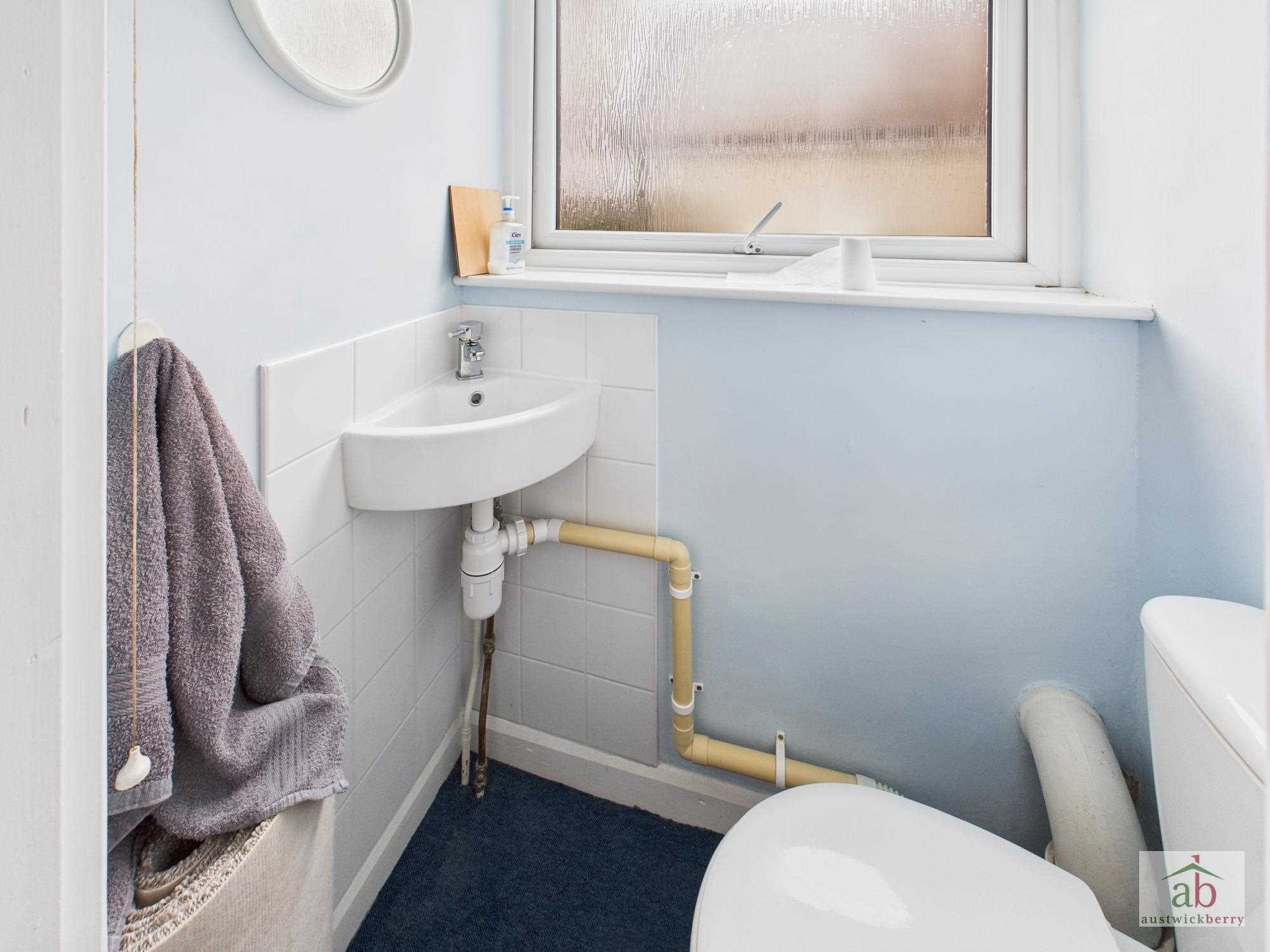 Low level wc, double glazed window to side, wall mounted hand wash basin.