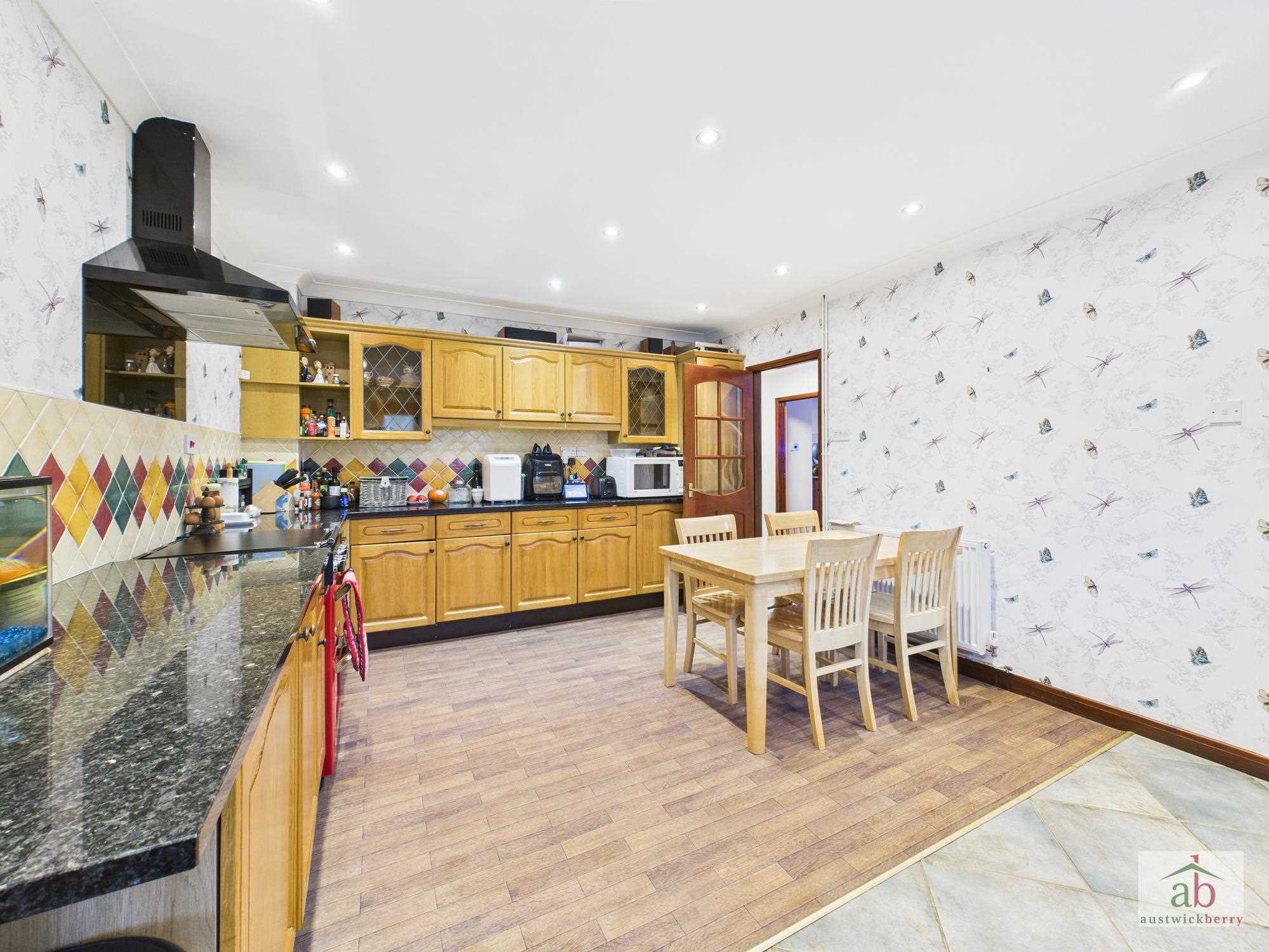 Double glazed rear facing window, space for American style fridge freezer, dishwasher, cooker point, extractor hood, granite work surface with matching wall and base units above and below, tiled splash backs, inset butler style sink with stainless steel mixer tap and water softener, door to large pantry cupboard.