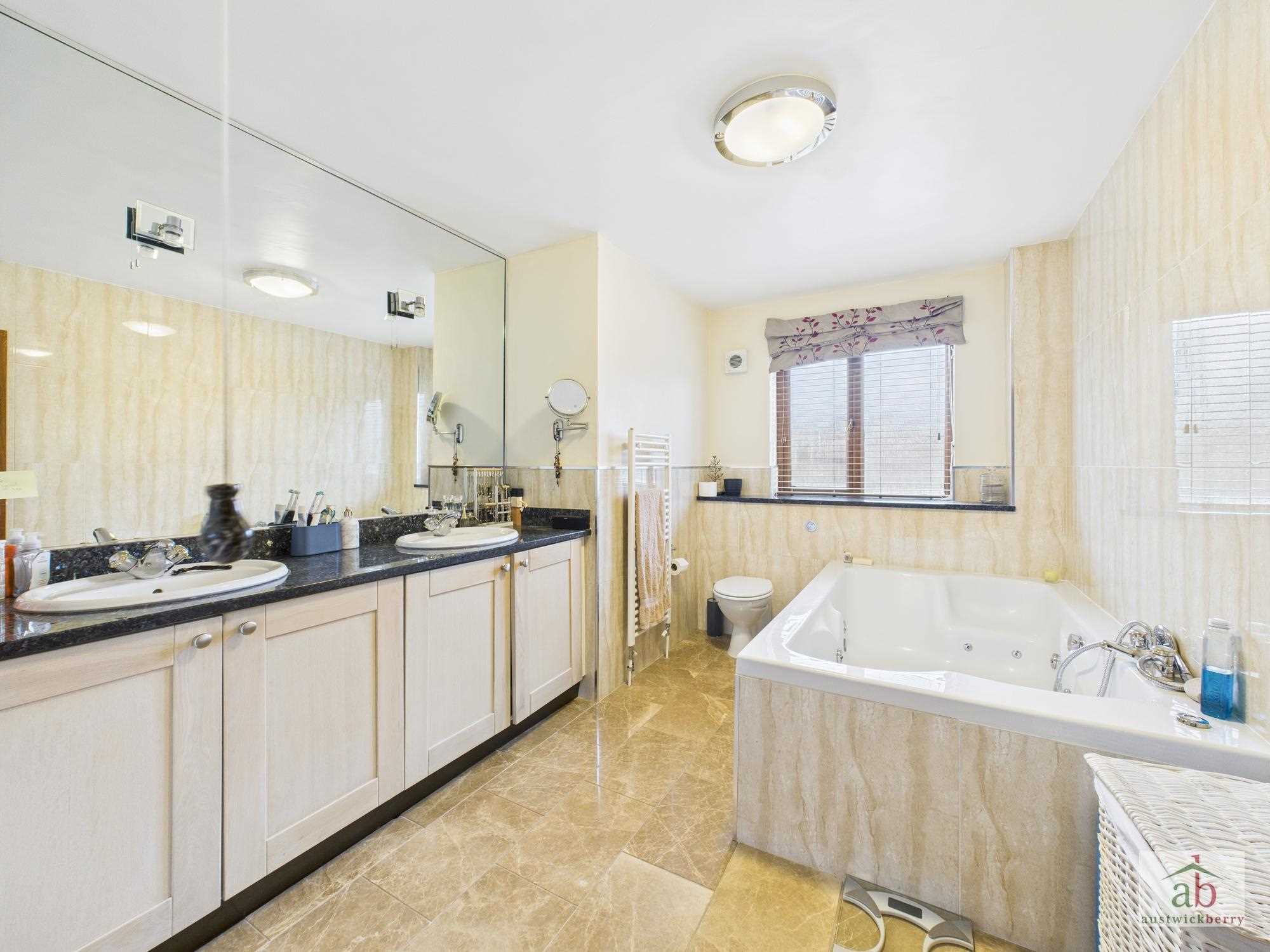 Jacuzzi styled bath, his and hers vanity wash basins, heated towel radiator, rear facing window and tiled splash backs.
