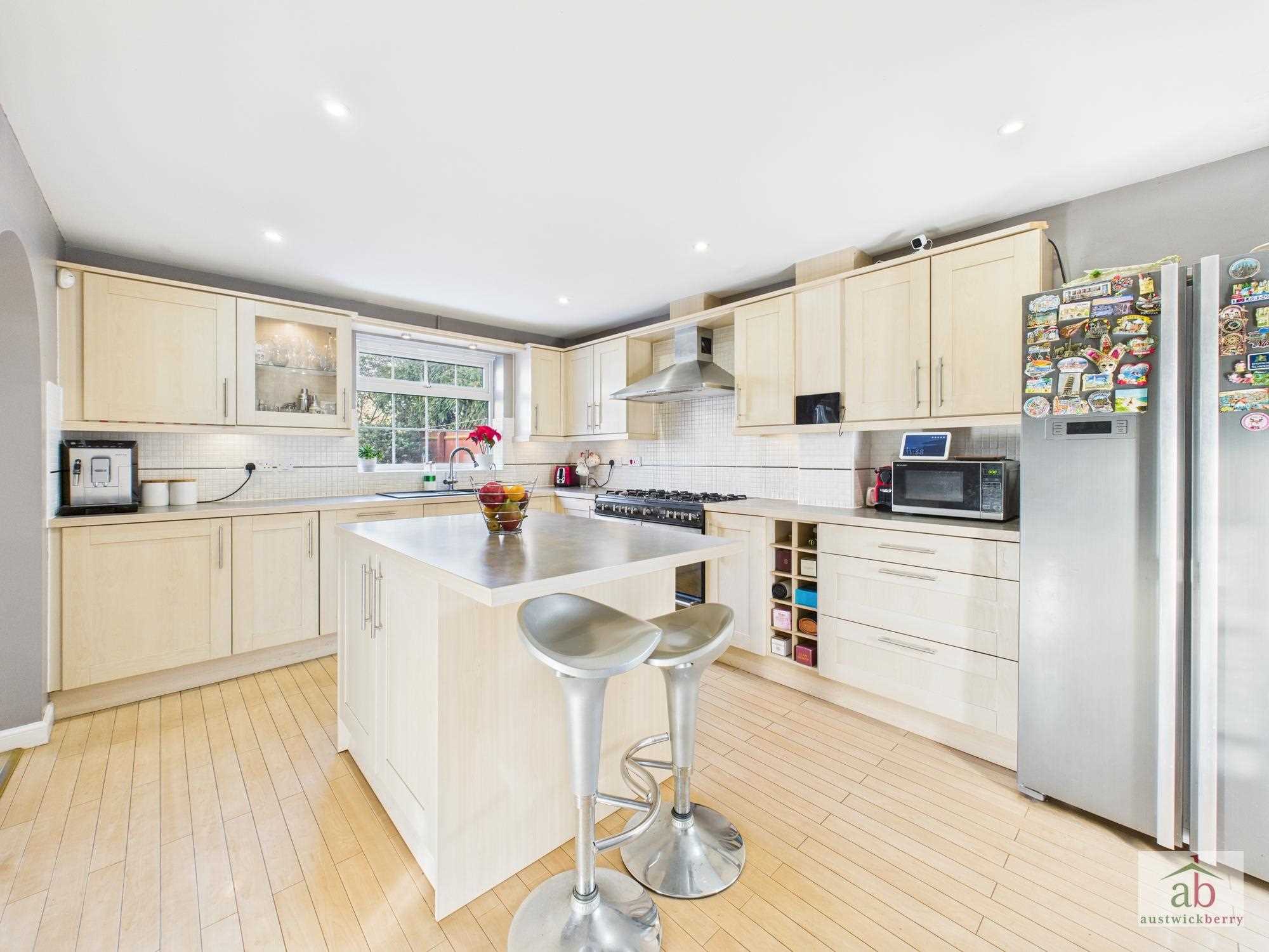 Inside, the welcoming entrance hallway leads to a spacious ground-floor cloakroom, a generous dual-aspect lounge, and a separate formal dining room. To the rear, an impressive conservatory with a glass roof. The heart of the home is the expansive kitchen/breakfast room, complete with a central island and ample storage.