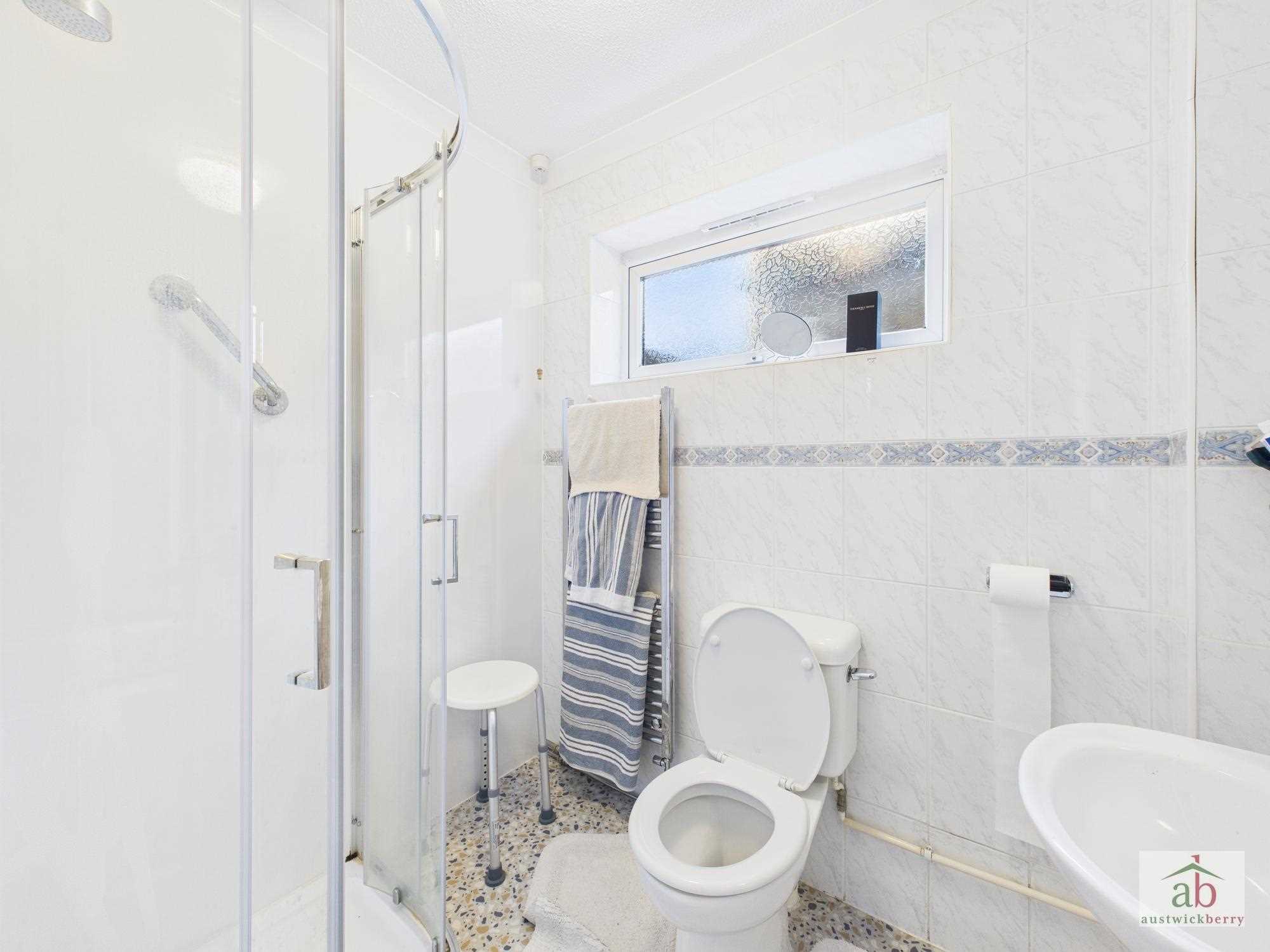 Double glazed window to side, pedestal hand wash basin, low level wc, quadrant shower enclosure, sliding glass shower screen, fully tiled, heated towel radiator.