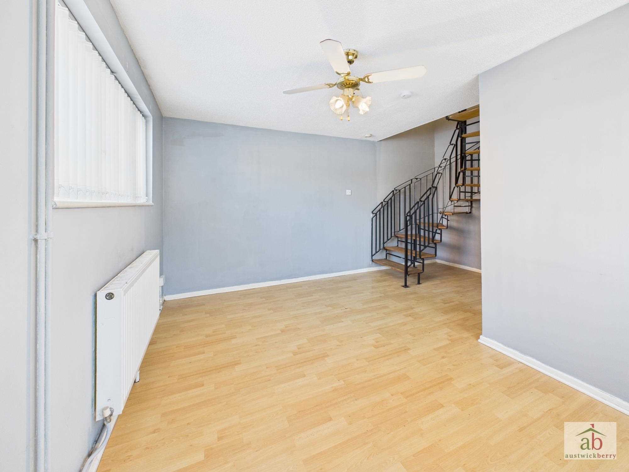 Double glazed front door and double glazed front facing window, double glazed window to side, double radiator beneath, laminate wood effect flooring, spiral staircase leading to first floor.