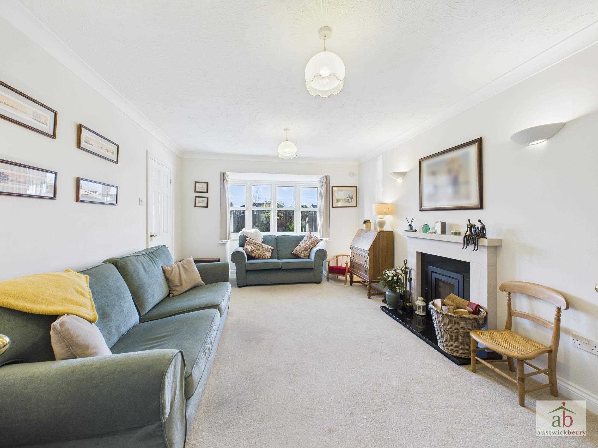Double glazed box bay window to front, luxury style fireplace with inset log burning stove, single radiator, glazed casement doors leading to open plan kitchen/diner.