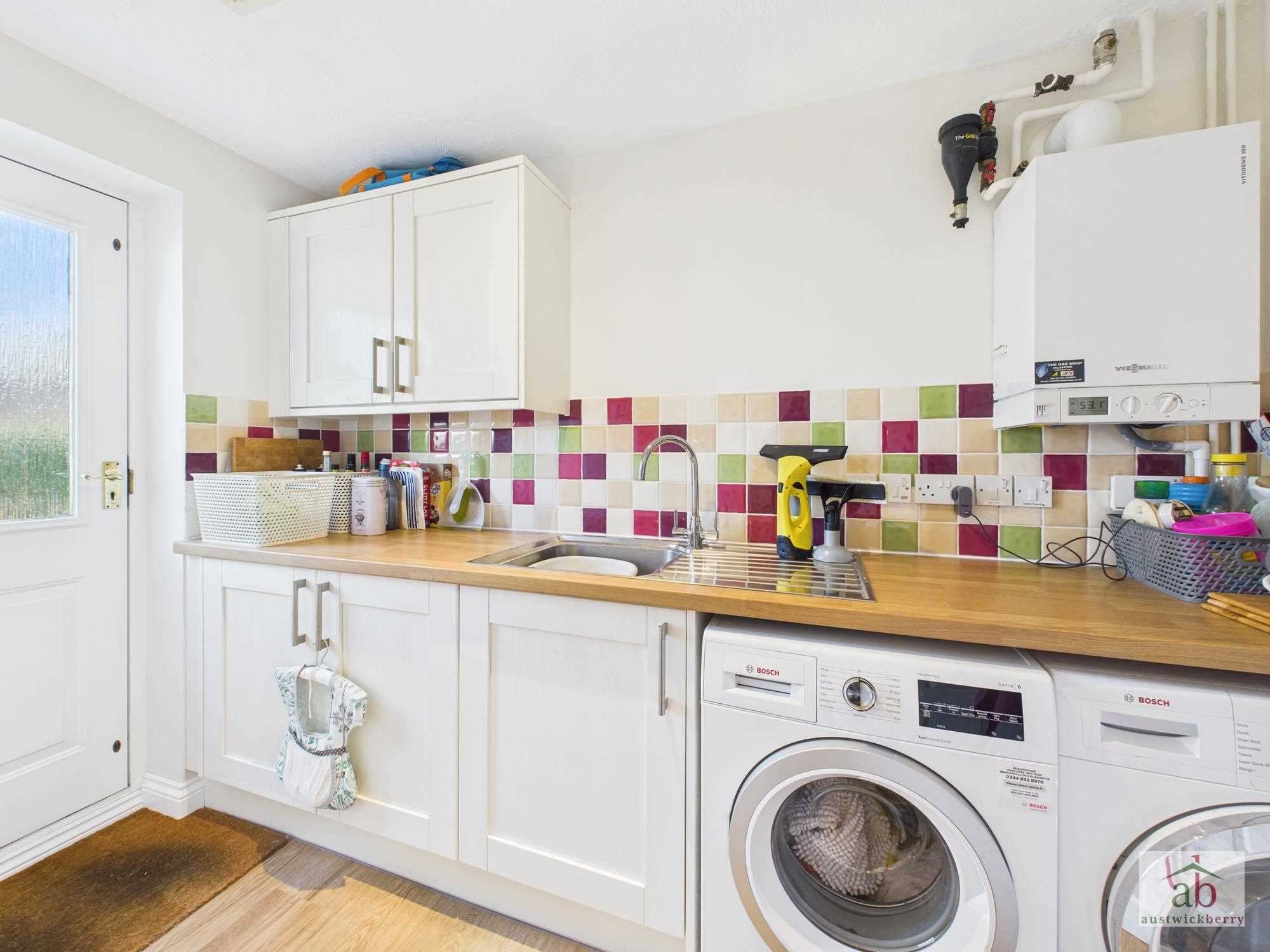Fire door to double garage, single radiator, double glazed door to rear, stainless steel sink and drainer set in work surfaces, space for tumble dryer, space for washing machine, wall mounted gas boiler, wall mounted cupboards, work surfaces with cupboards under.