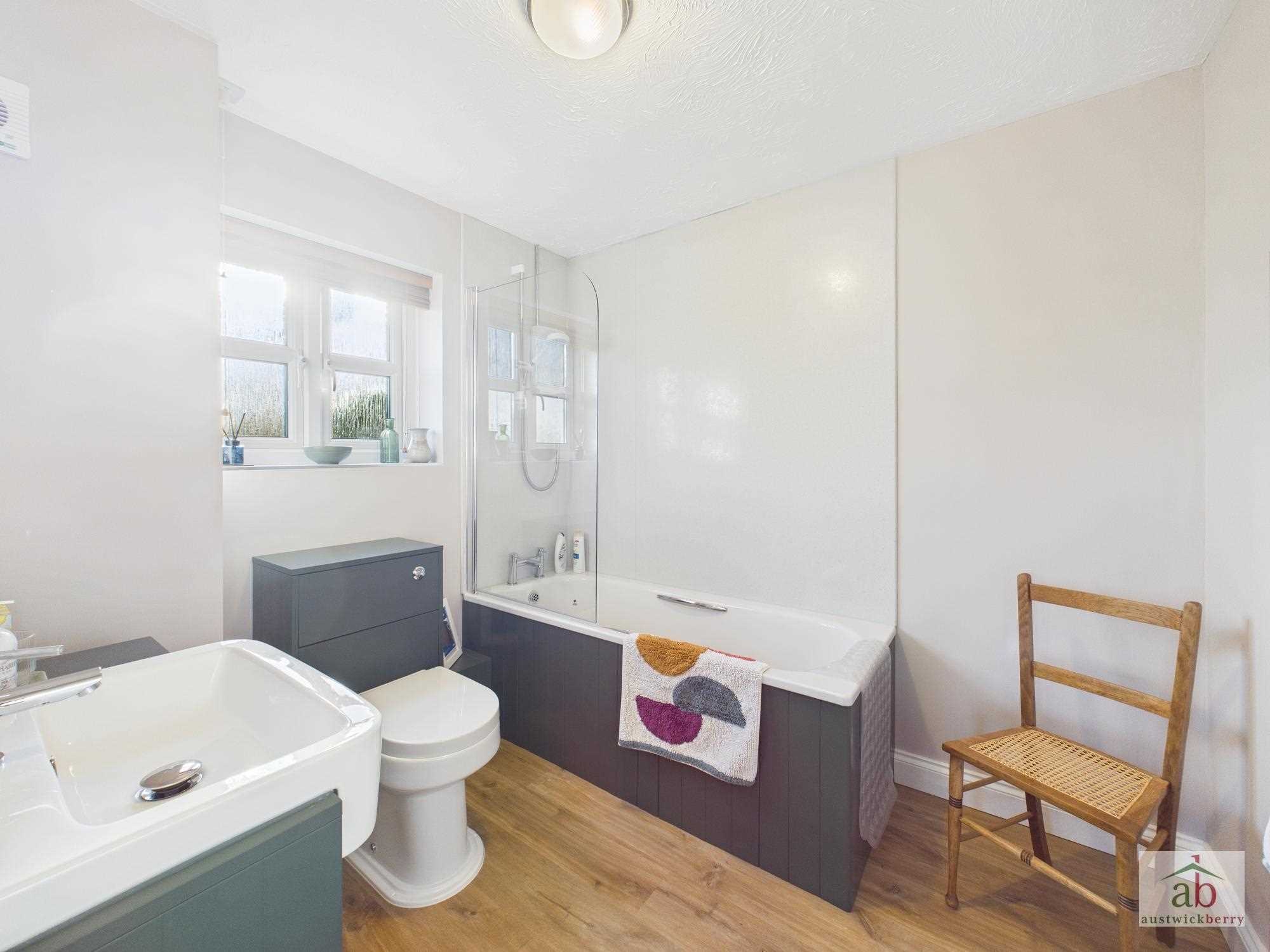 Shaver point, double glazed window to side, vanity hand wash basin with vanity cupboards under, low level wc, panel enclosed bath with mixer taps, wall mounted shower, glass shower screen, contemporary towel rail.