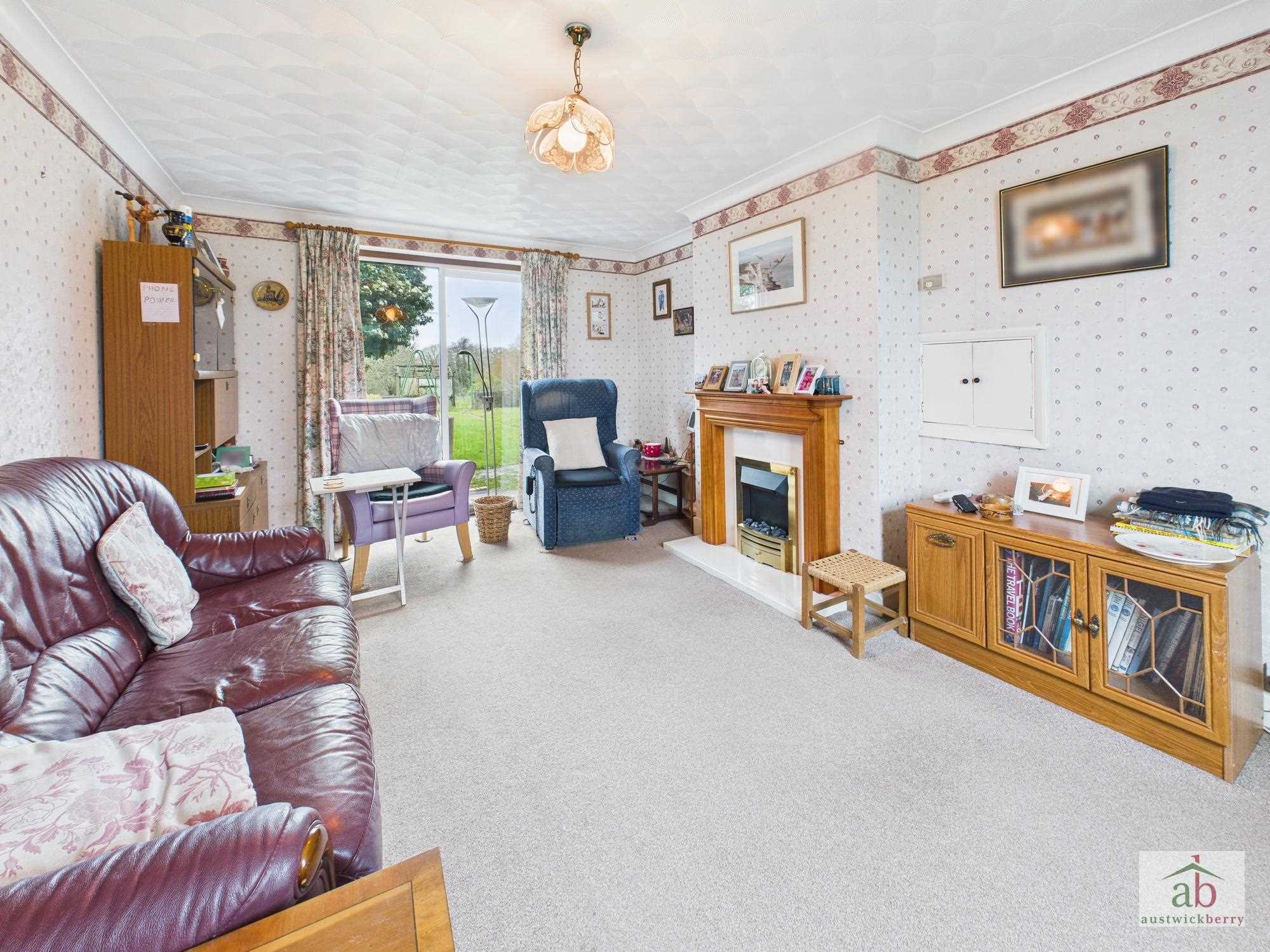 Double glazed window to front, single radiator, double glazed doors to rear, feature fireplace, serving hatch to kitchen.