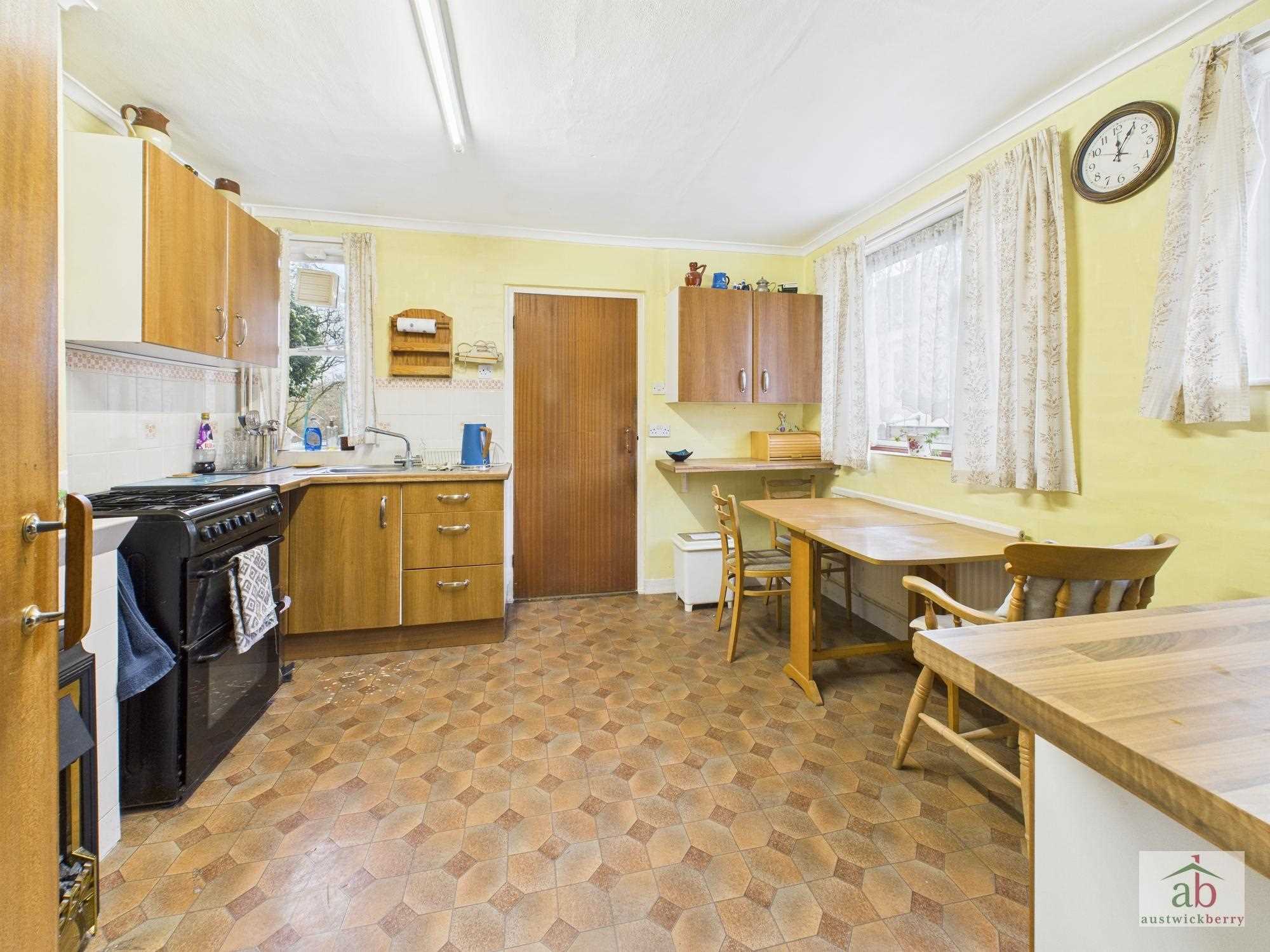 Double glazed window to side x2, stainless steel sink and drainer, wall mounted cupboards, further window to rear, further work surfaces with cupboards under, space for cooker, space for fridge freezer.