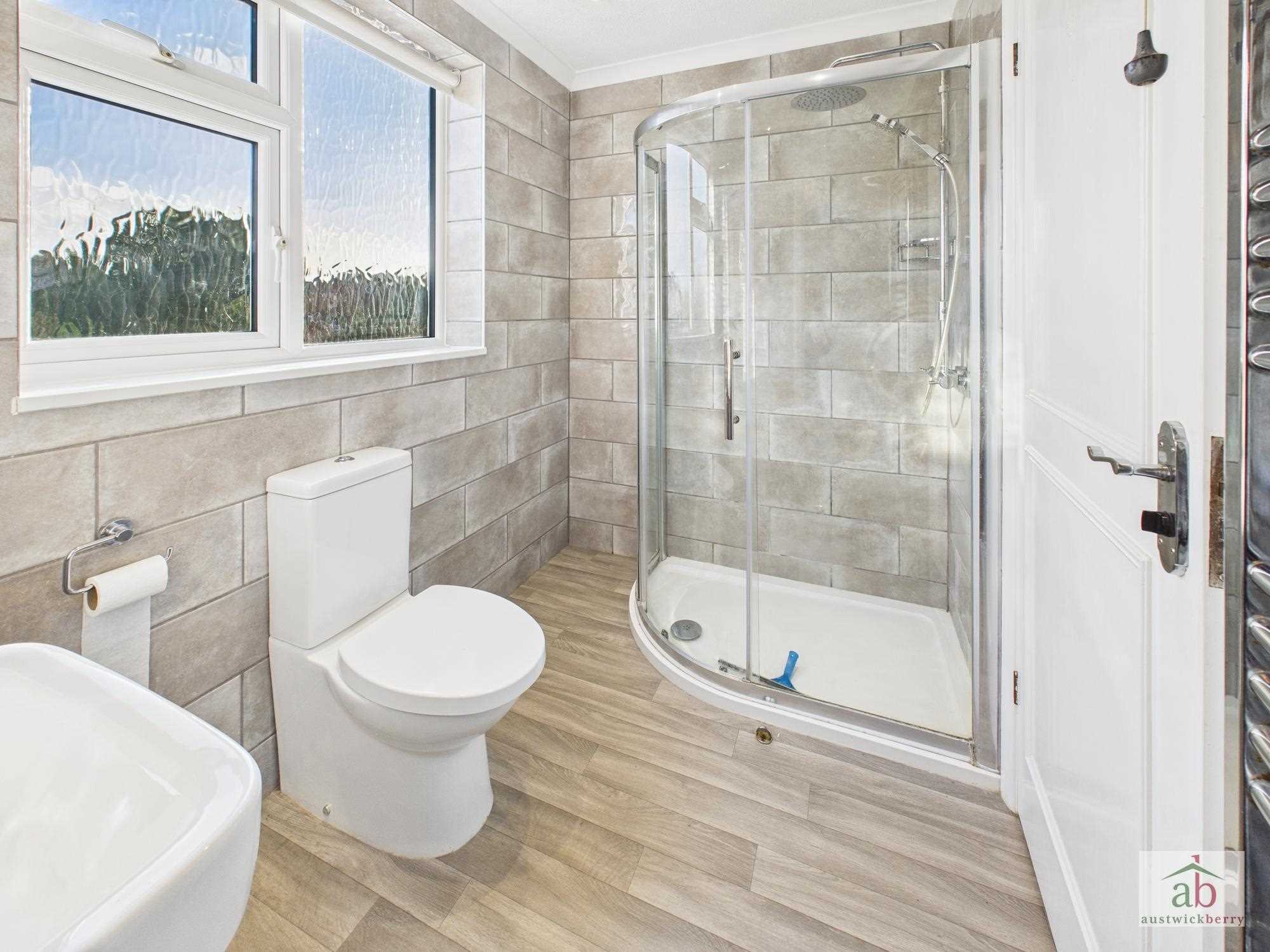 Double glazed window to rear, luxury wall tiles, shower cubicle, low level wc, pedestal hand wash basin with mixer taps, contemporary towel rail.