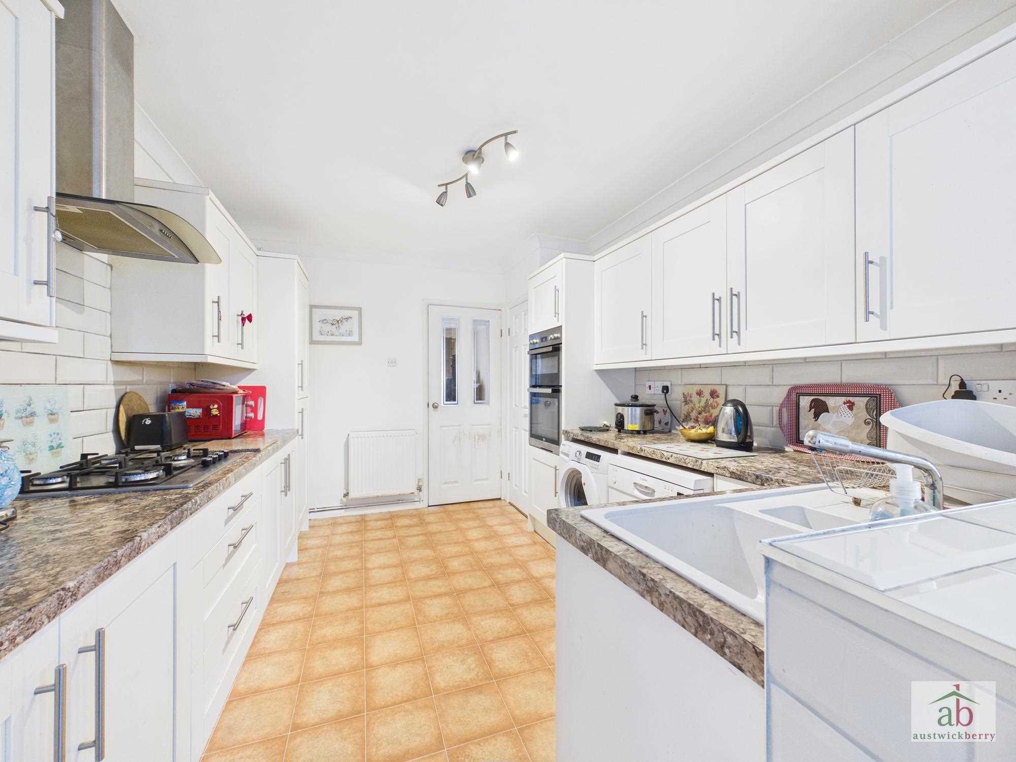 Double oven, work surfaces, space for dishwasher, space for washing machine, one and a half ceramic sink with mixer taps set in work surfaces, bank of wall mounted cupboards, luxury wall tiling, integrated extractor/hob, integrated fridge freezer, further wall mounted cupboards, further work surfaces. Open plan to dining room.