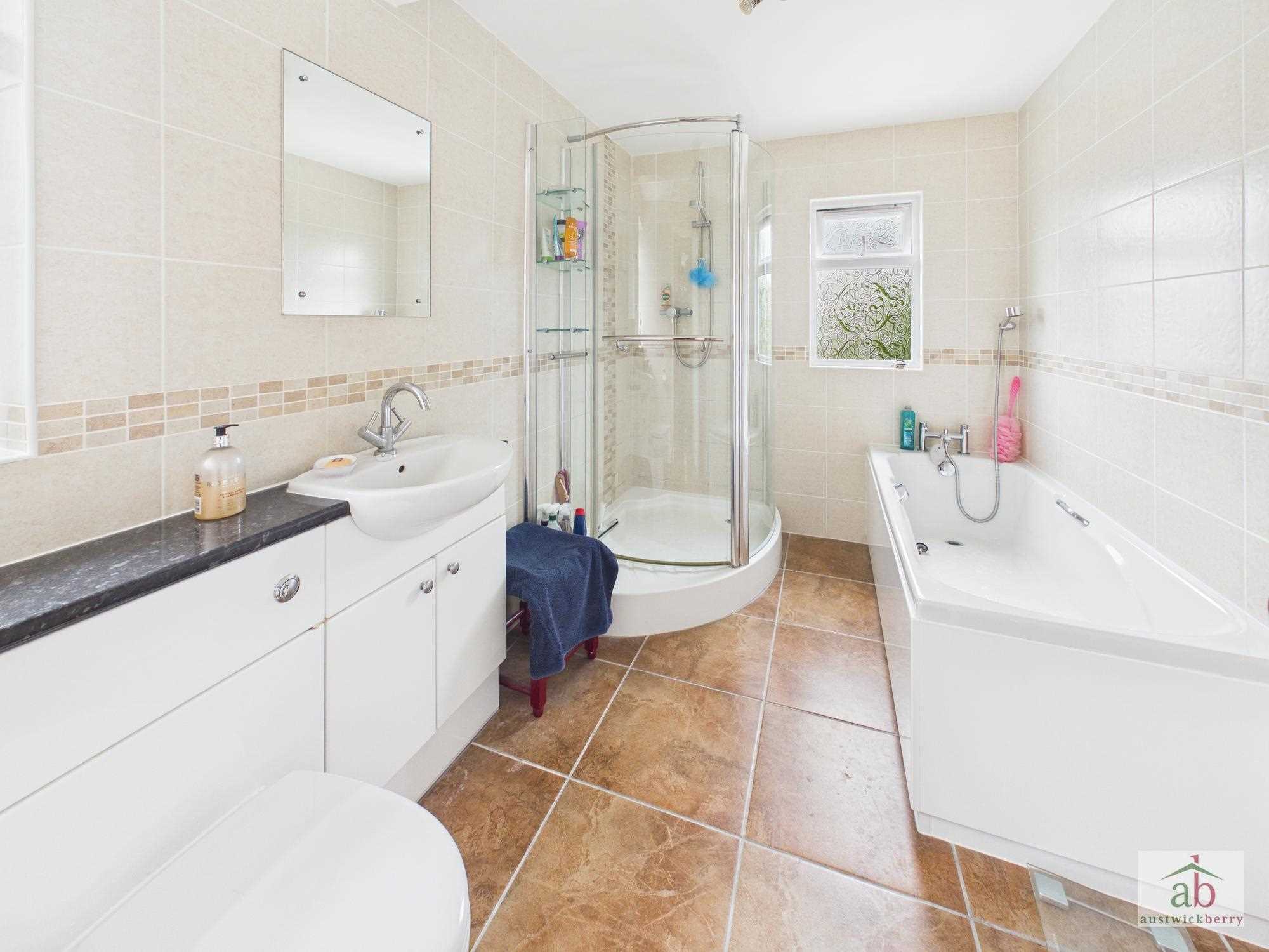 Double glazed window to side, vanity hand wash basin with cupboards under, low level wc with vanity counter over, large shower cubicle, luxury tiling, panel enclosed bath with mixer taps and shower attachment, tiled floor, contemporary towel rail.