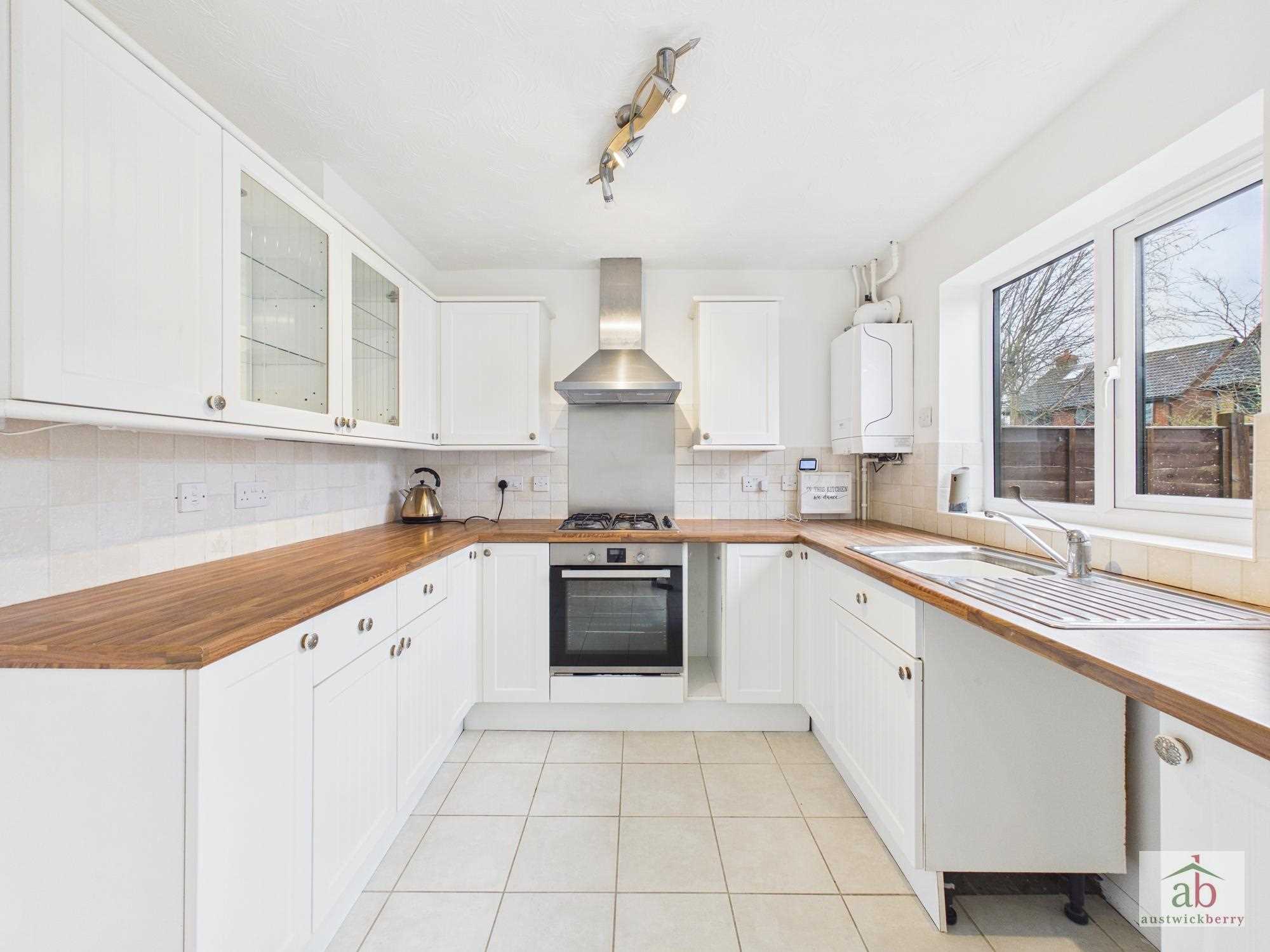 Double glazed window to rear double glazed doors overlooking rear garden, tiled floor, wall mounted gas boiler, integrated hob/oven/extractor, chrome splashback, half tile surround, range of wall mounted cupboards, wall mounted display cabinets. further work surfaces with cupboards and drawers under, single radiator.