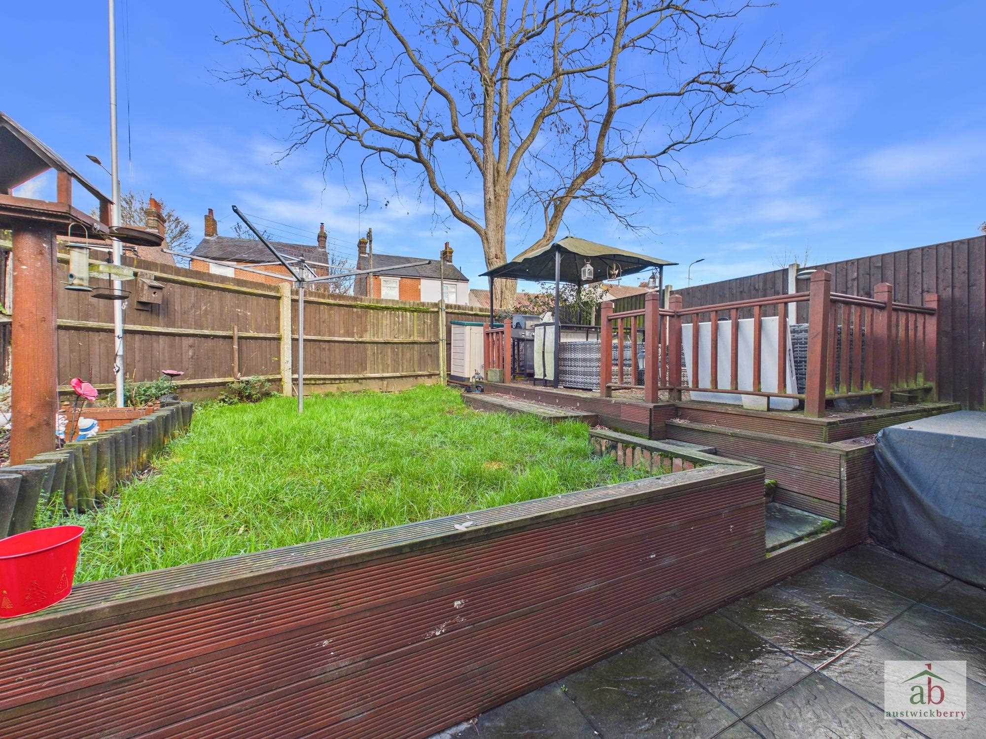 Paved front garden with railings, large storage shed to side. Rear garden with patio area, raised lawn area, decking and further raised decking area, enclosed by panel fencing with rear access door to shed.