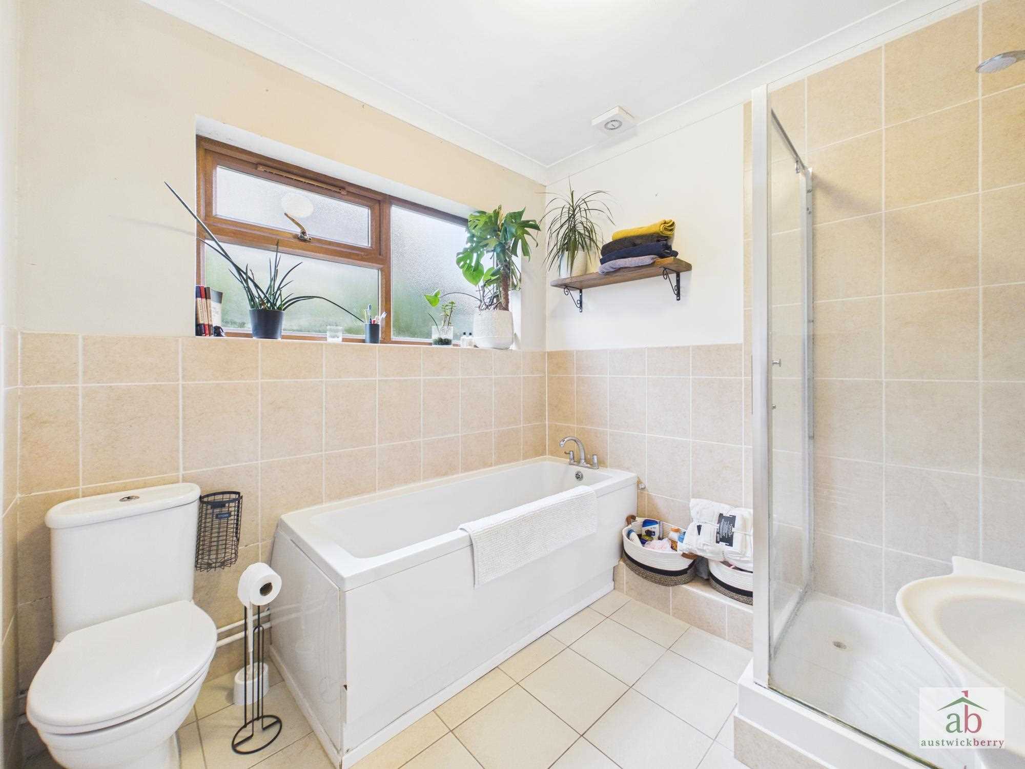 Half tiled walls, contemporary towel rail, double glazed window to side, tiled floor, panel enclosed bath with mixer taps, low level wc, shower cubicle, vanity hand wash basin.