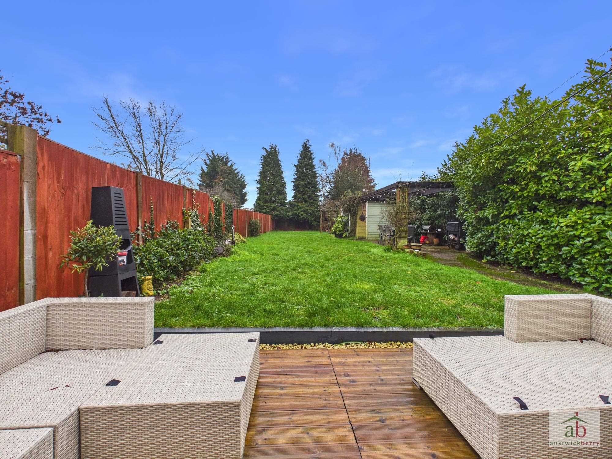 Large driveway to front providing off-street parking for multiple vehicles. Side access to rear garden with newly laid decking area, large lawned south-facing rear garden, enclosed by panel fencing, un overlooked, outdoor pergola and patio seating area. Detached garage with up and over door (has been converted into a studio).