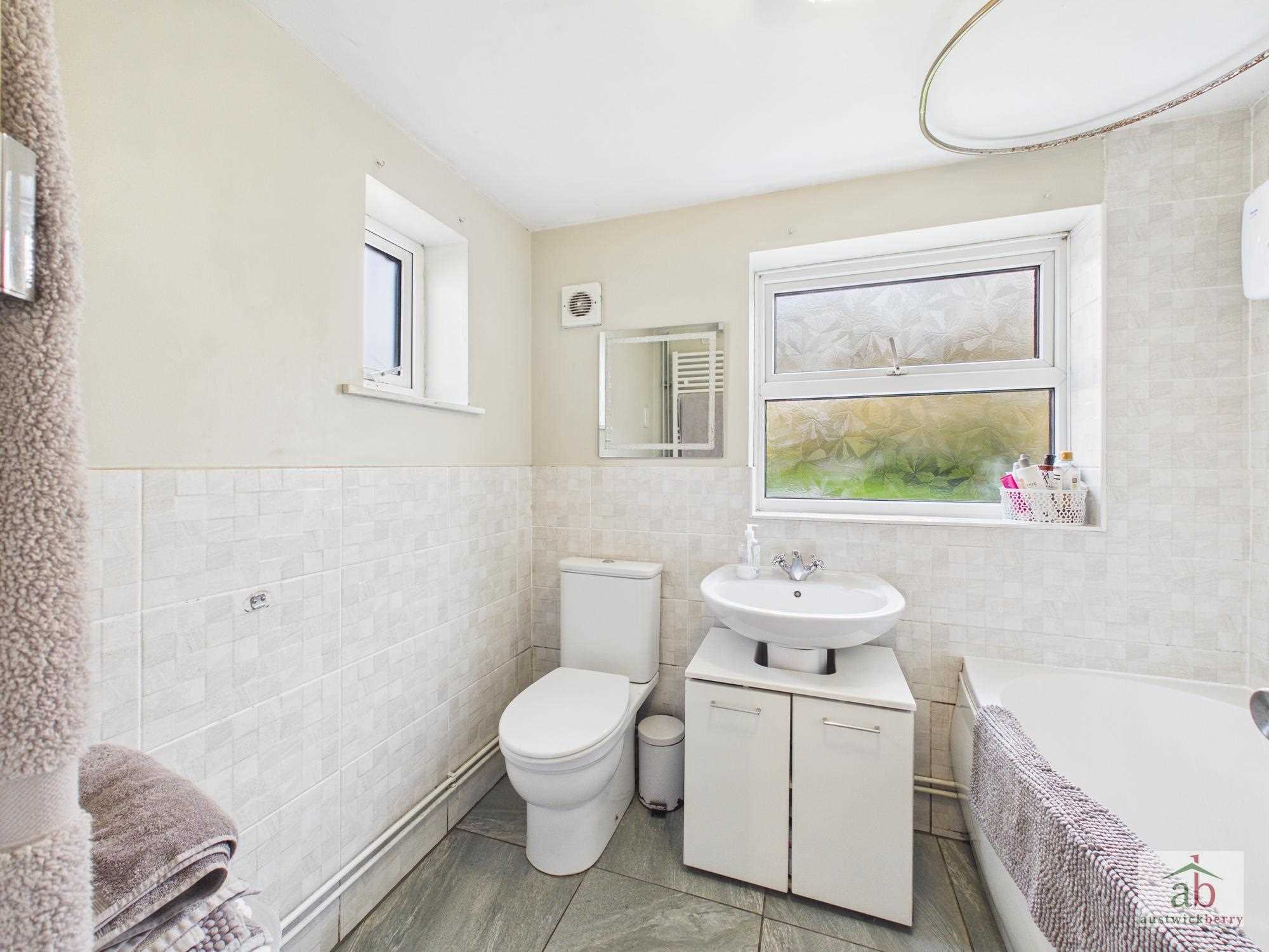 Double glazed window to rear, low level wc, pedestal hand wash basin with mixer taps, panel enclosed bath, wall mounted shower, contemporary towel rail, tiled floor.