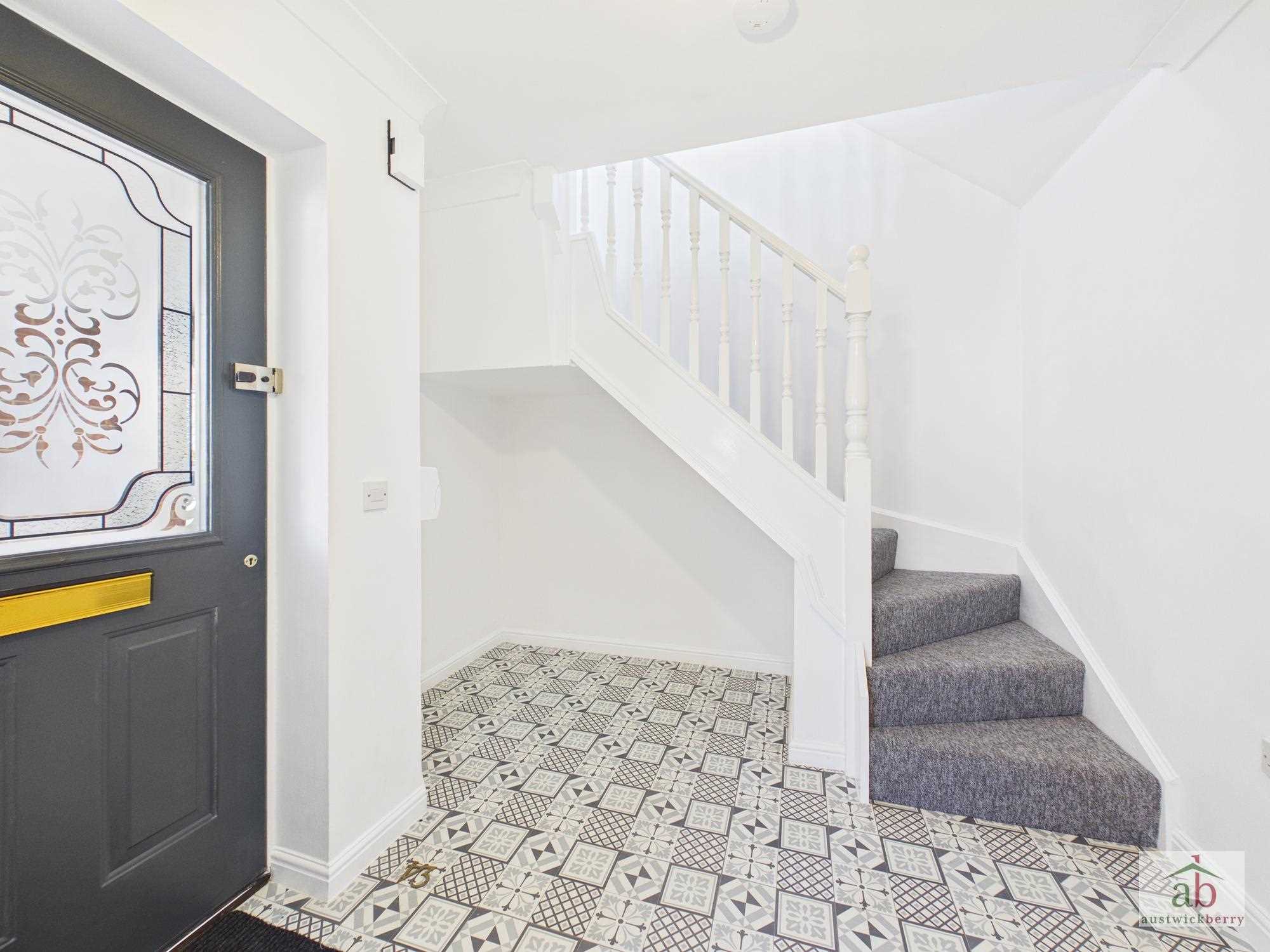 Double glazed front door into entrance hallway, under stairs alcove desk area, stairs to first floor, double radiator.
