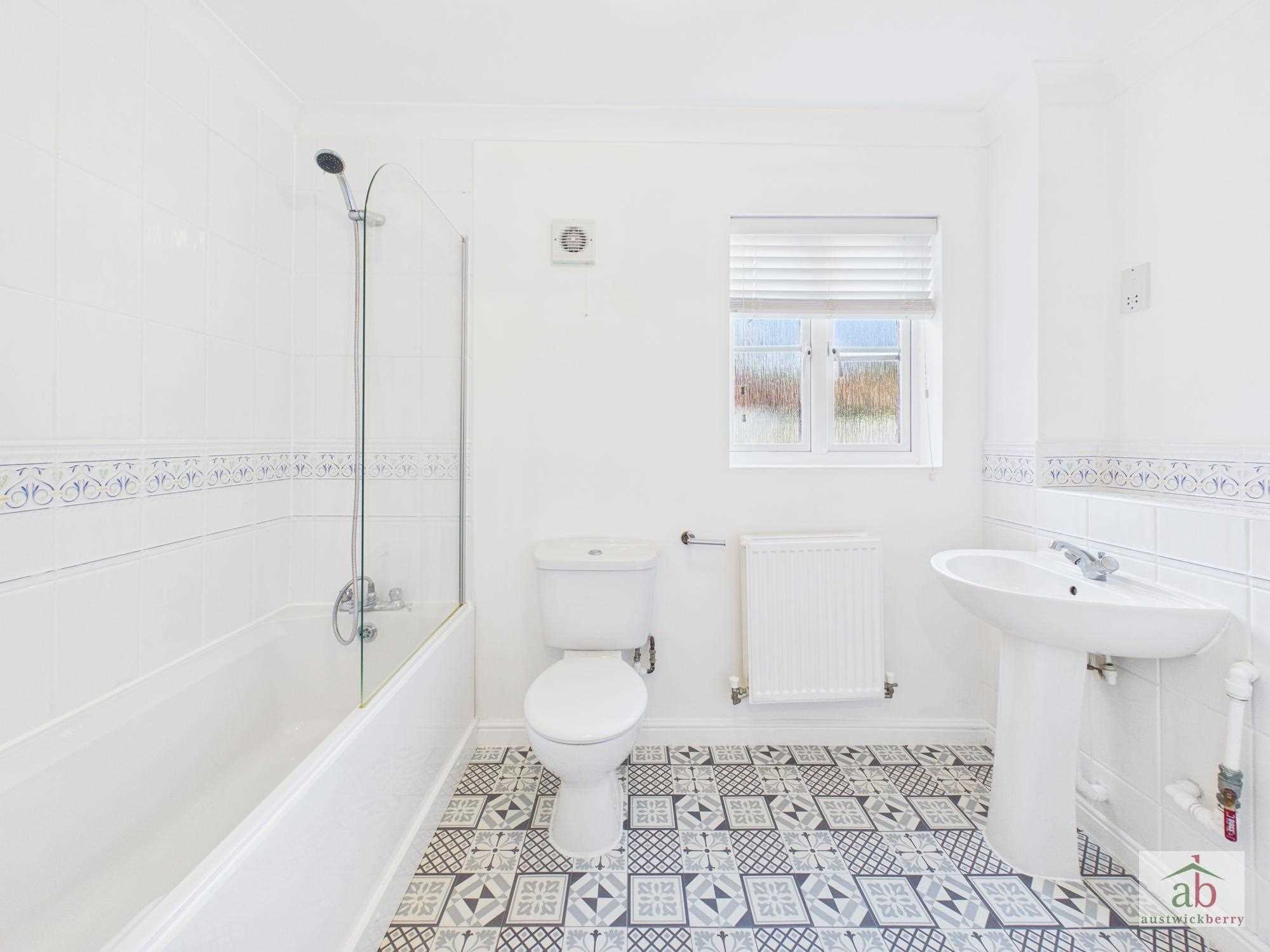 Double glazed window to rear, pedestal hand wash basin, low level wc, panel enclosed bath with glass shower screen, shower mixer attachment, tiled splashbacks, double radiator.