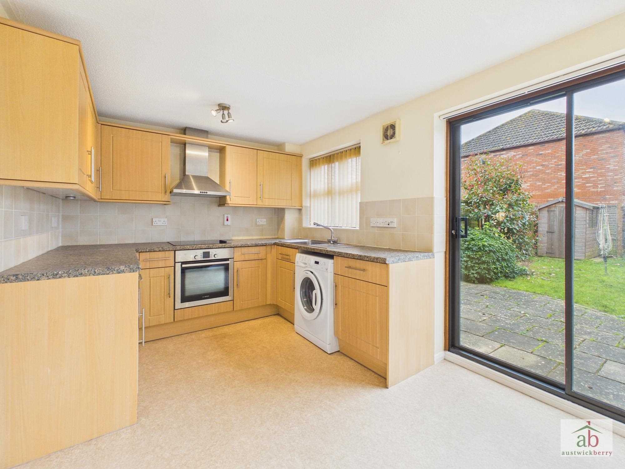 Double glazed window to rear, double glazed sliding door to rear, stainless steel sink and drainer unit with mixer tap, electric hob and oven with extractor hood over, work surfaces with matching fitted wall and base units above and below, space for washing machine, integrated fridge and freezer, tiled splashbacks, electric storage heater, space for dining table.
