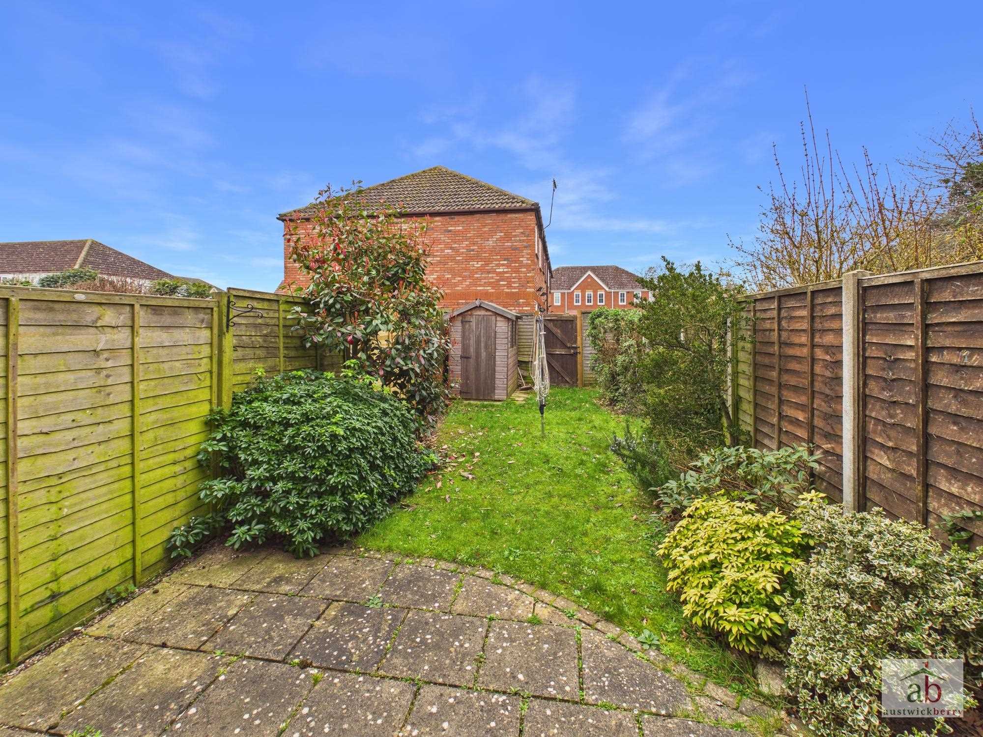 Lawned area with borders of plants and shrubs, enclosed by panel fencing with rear access gate and hard stand for shed, patio seating area. To the front is a lawned area with a pathway leading to the front, allocated parking space.