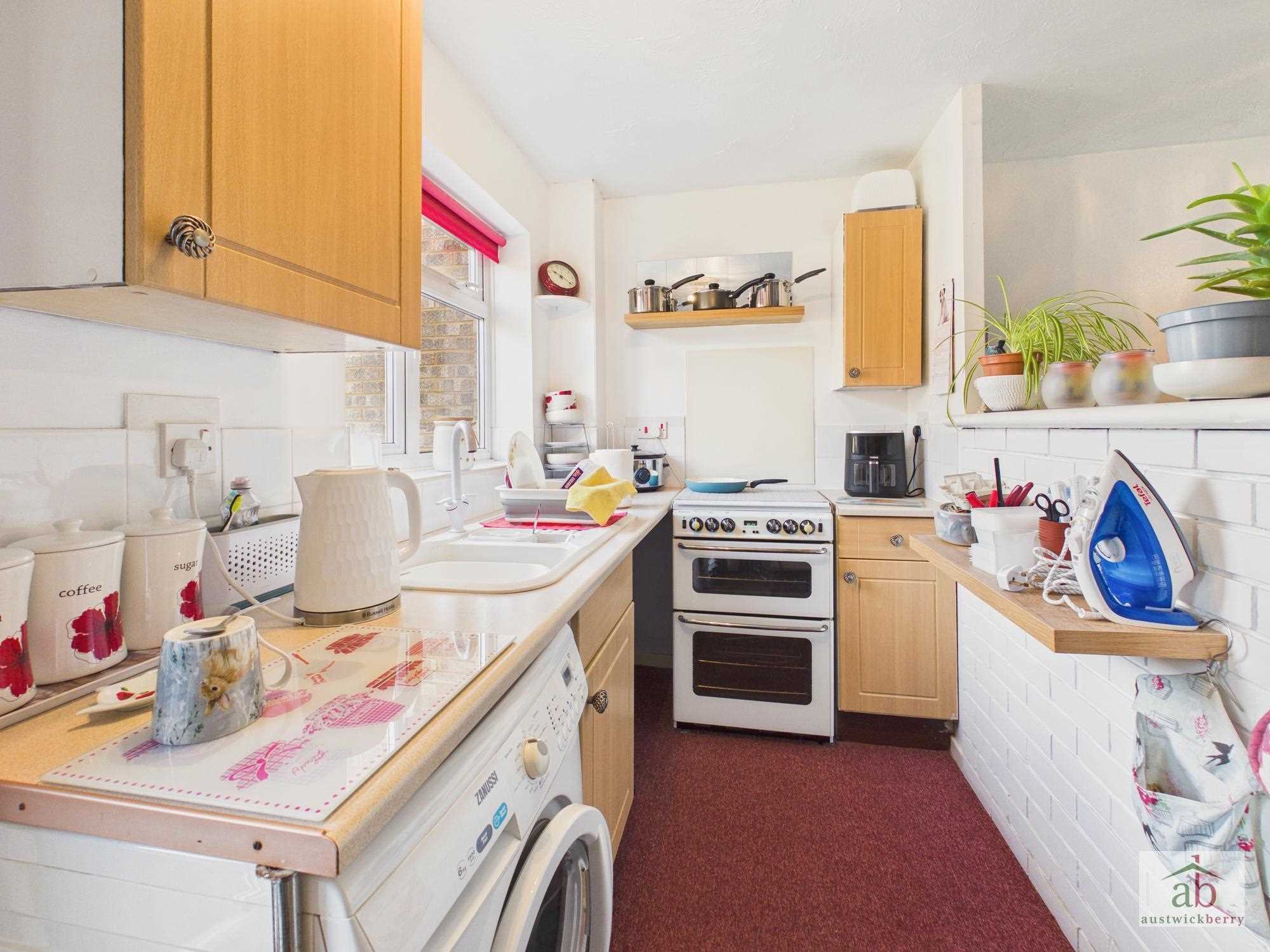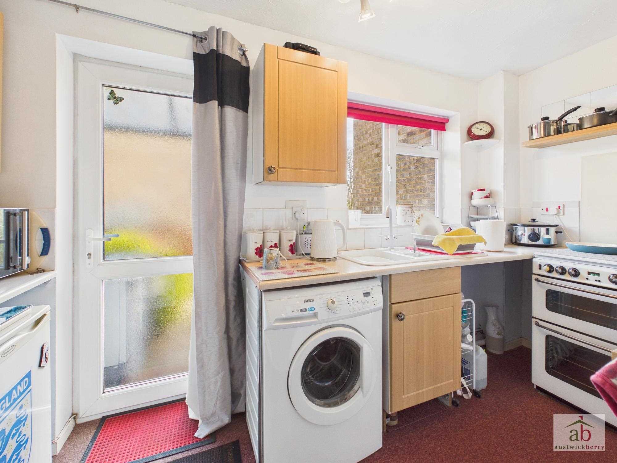 Double glazed window and door to rear, work surfaces with fitted wall and base units above and below, one and a half sink and drainer unit with mixer tap, plumbing for washing machine, space for cooker, space for fridge and freezer, double radiator, tiled splashbacks.