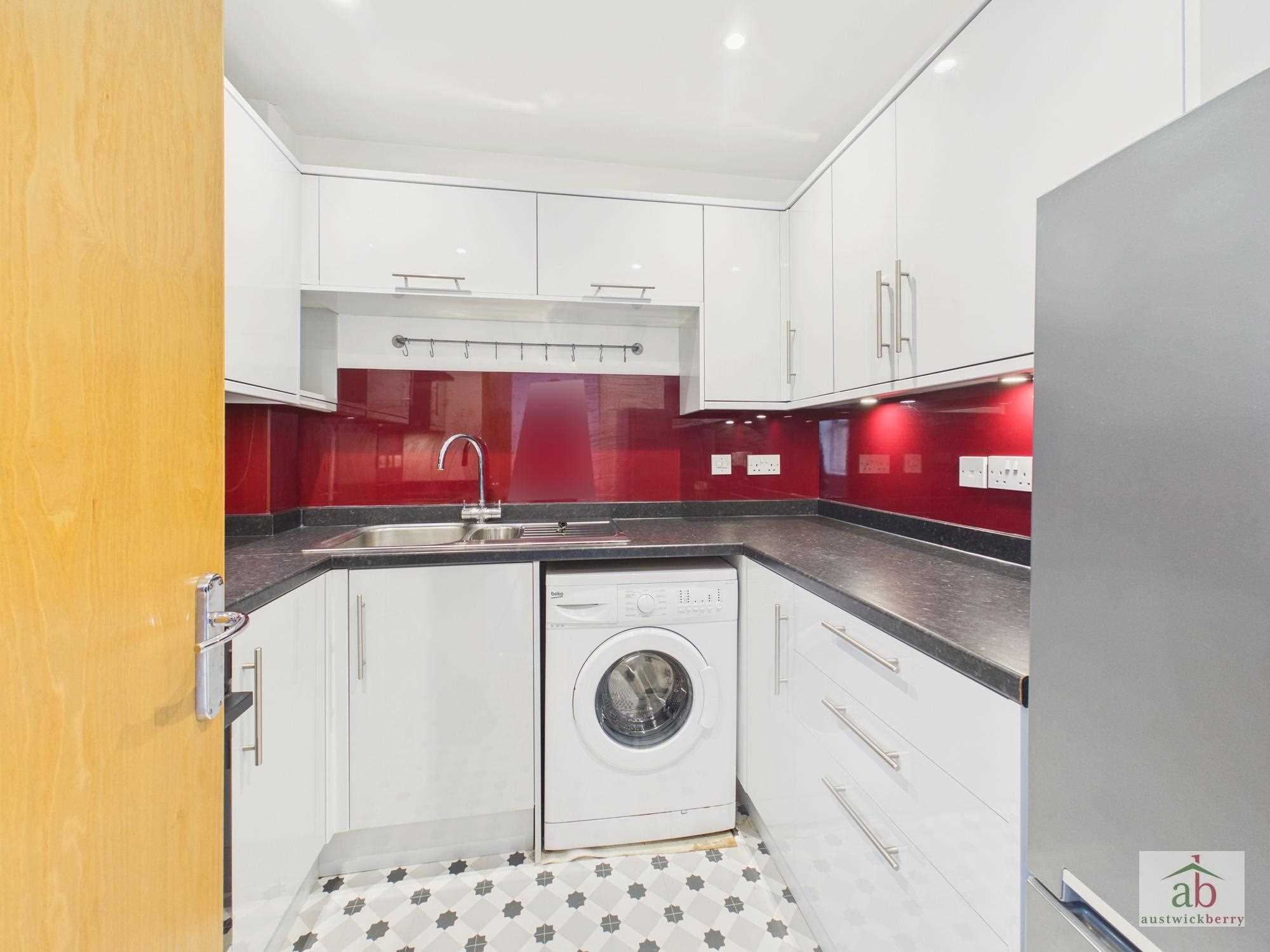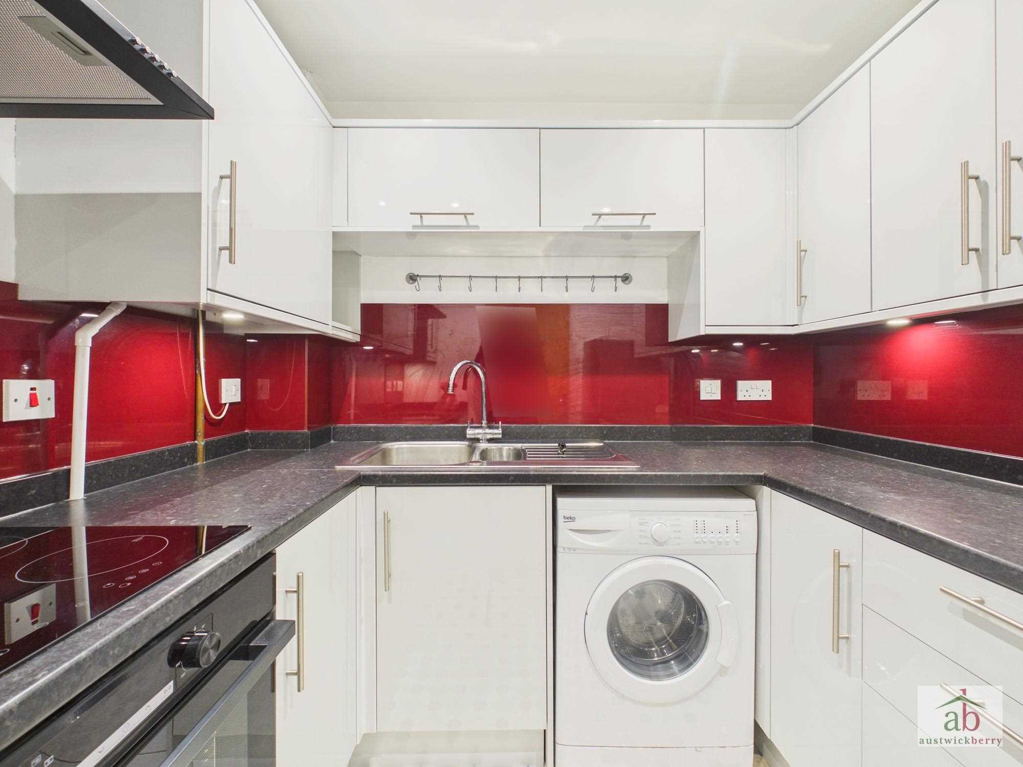 Wall mounted high gloss cupboards, integrated hob/oven/extractor with chrome splashbacks, cupboard housing gas boiler, contemporary upstands, washer/dryer and fridge/freezer to remain.