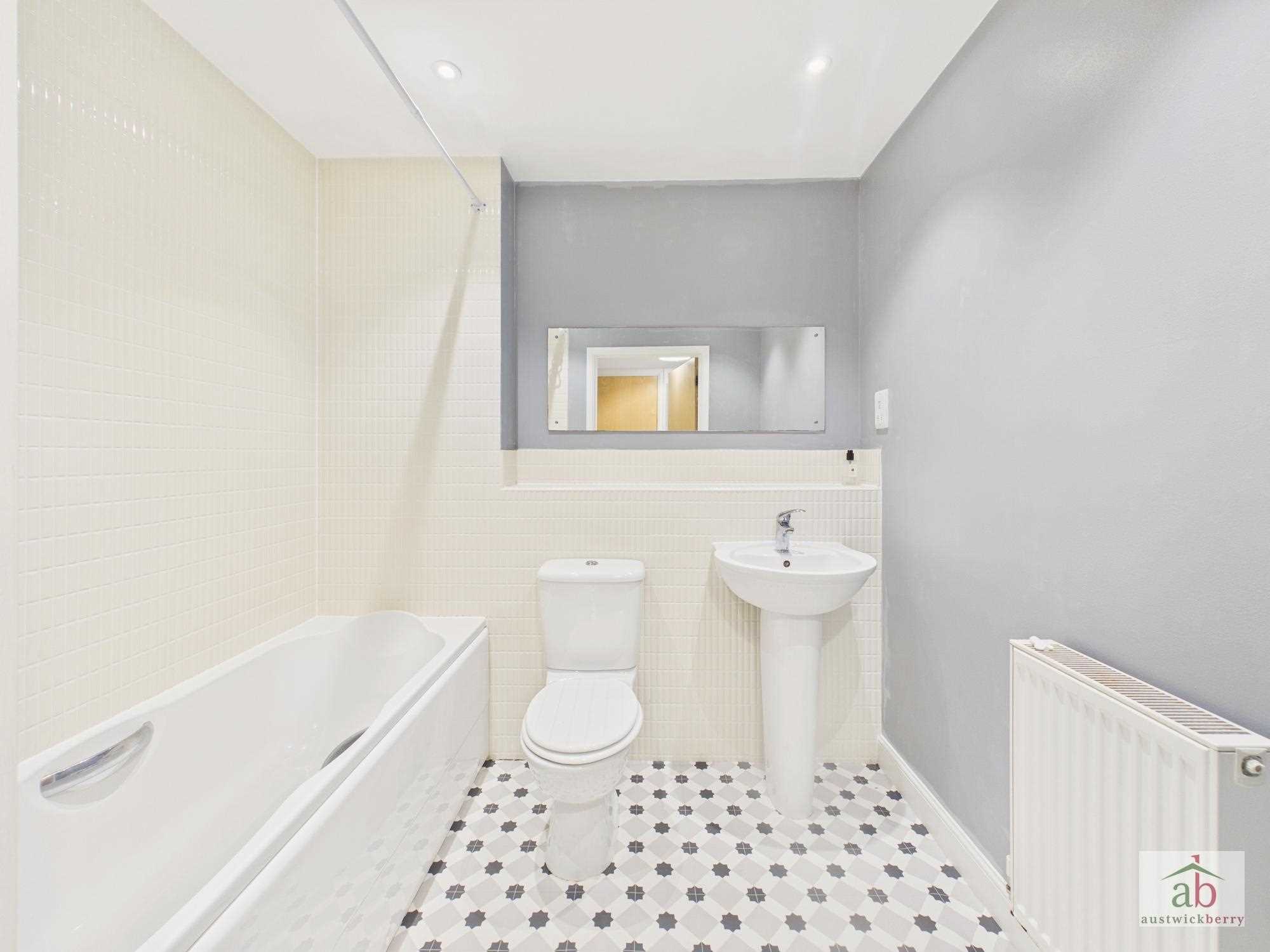 Single radiator, pedestal hand wash basin with mixer taps, low level wc, panel enclosed bath with mixer taps and shower attachment, wall tiles, large bathroom mirror, shaver point